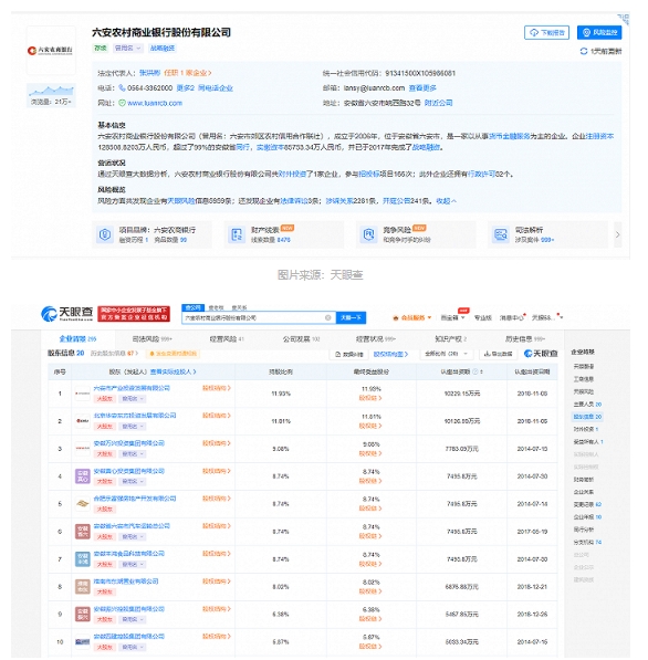 界面安徽从天眼查获悉,六安农村商业银行股份有限公司(曾用名:六安市郊区农村信用合作联社),成立于2006年,位于安徽省六安市,是一家以从事货币金融服务为主的企业。其中,最大股东为六安市产业投资发展有限公司,持有比例为11.93%。