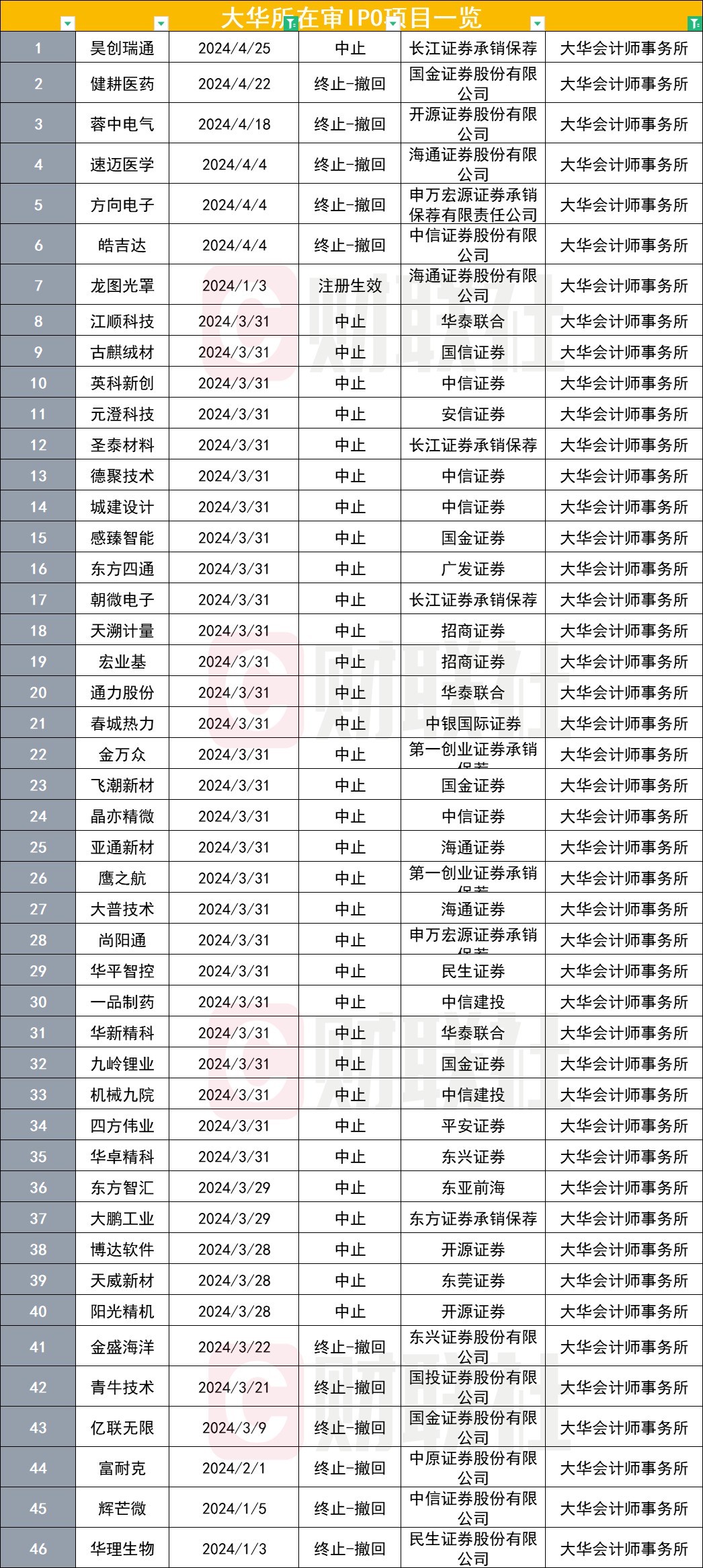 今年以来(截至5月13日),已有46个大华所提供审计服务的IPO项目终止或中止,其中因撤回材料的终止项目多达12个,中止项目有34个。4月份因撤回材料终止的IPO项目有6个,4月中旬前后即有大华所证券服务业务被暂停的消息传出。