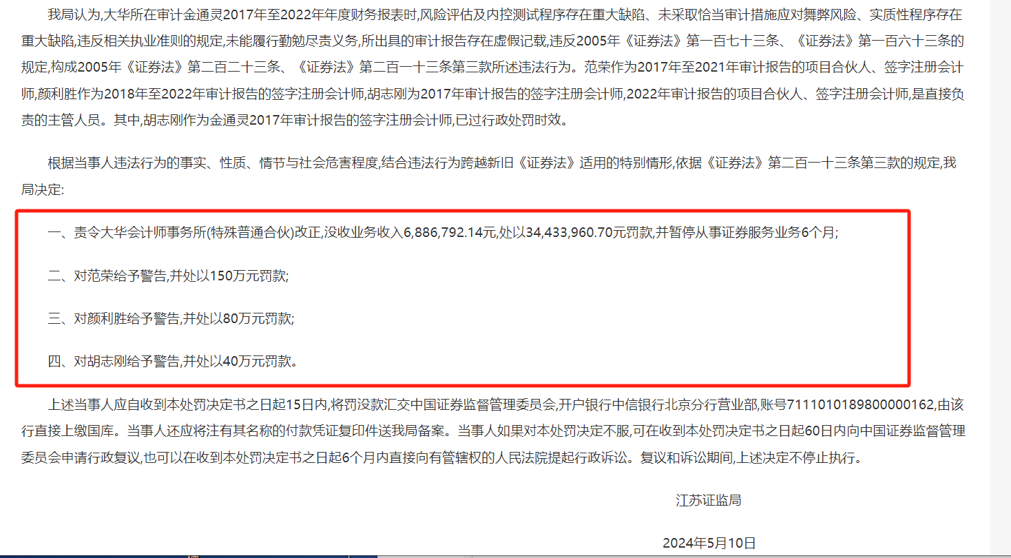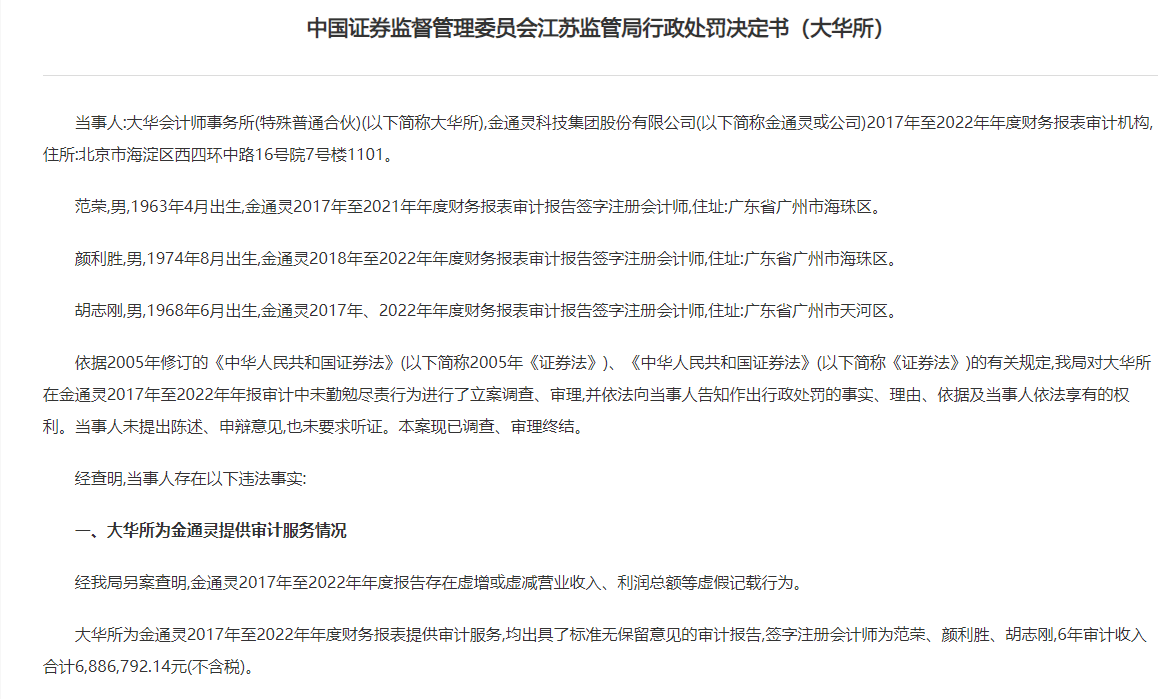 江苏证监局指出,大华所在审计金通灵(1.700, -0.12, -6.59%)(维权)2017年至2022年年度财务报表时,风险评估及内控测试程序存在重大缺陷、未采取恰当审计措施应对舞弊风险、实质性程序存在重大缺陷,违反相关执业准则的规定,未能履行勤勉尽责义务,所出具的审计报告存在虚假记载。