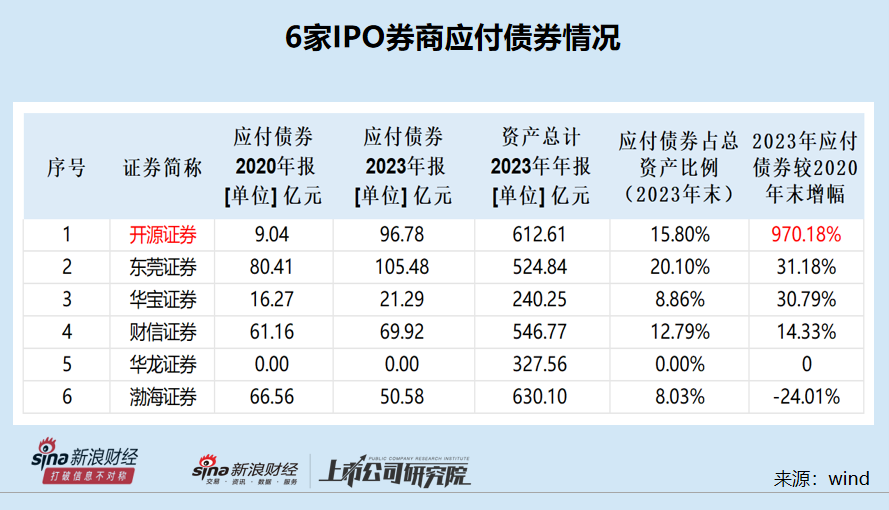 与其他5家排队IPO的券商相比,开源证券的应付债券增长速度过快。2023年末,开源证券的应付债券账面金额为96.78亿元,较2020年末的9.04亿元增长了970.18%,接近10倍。开源证券三年接近10倍的应付债券增速,显著高于其他5家券商的31.18%、30.79%、14.33%、0、-24.01%。