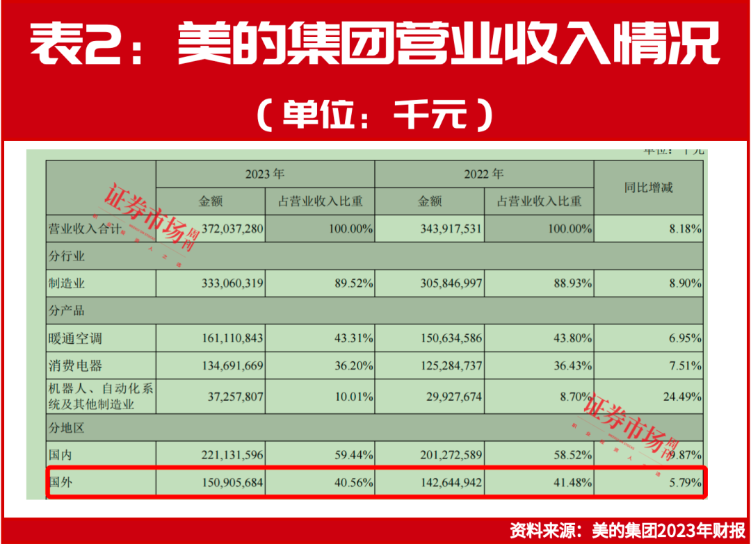 公司2023年财报显示, 美的集团海外业务的毛利率也略高于国内业务 ,2023年两者分别为27.16%,26.01%。同比增长速度也是海外业务的3.57%更高,而国内业务为1.33%。