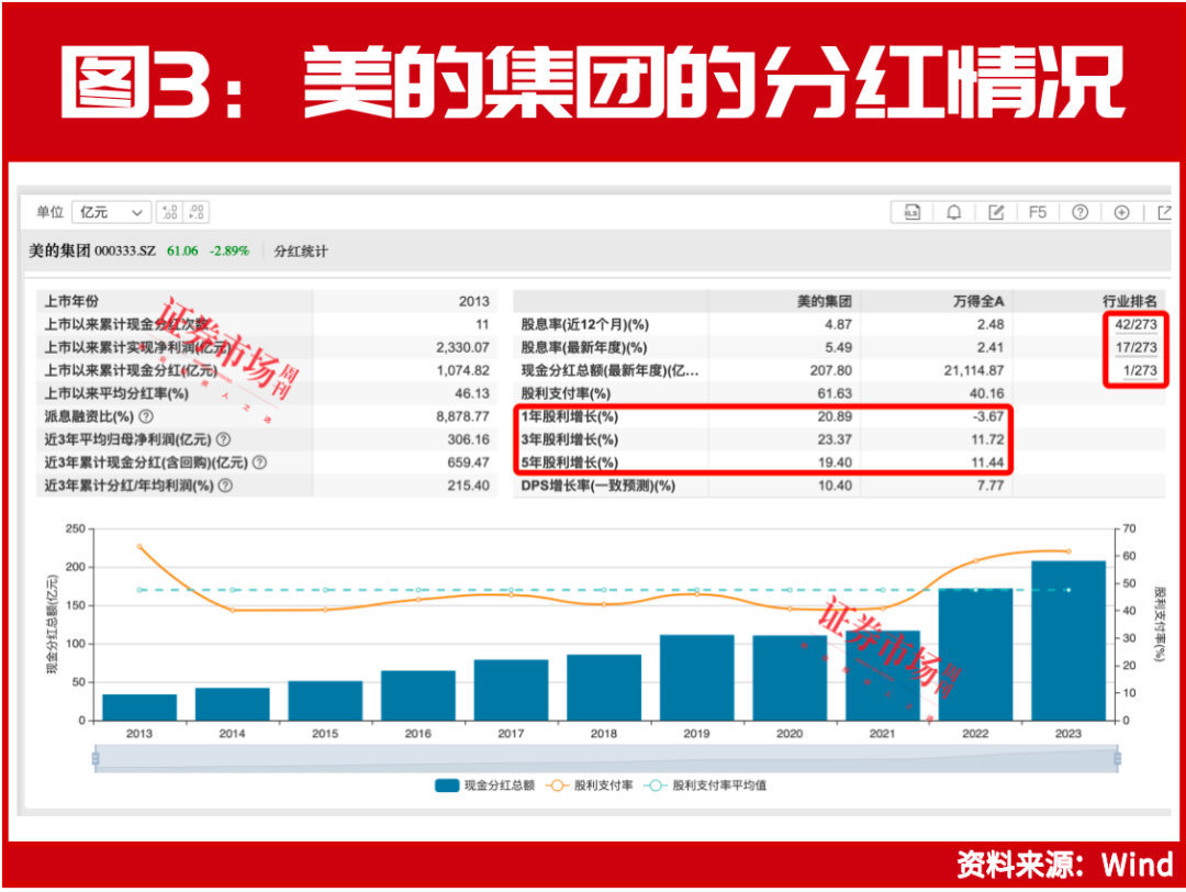 除了股价的上涨,自上市以来至2023年,公司持续11个年度分红,分红总额达1074.82亿元,公司的分红率为46.13%,股息支付率为61.63%,在整体A股和所处的家电行业都排名靠前(见图3)。