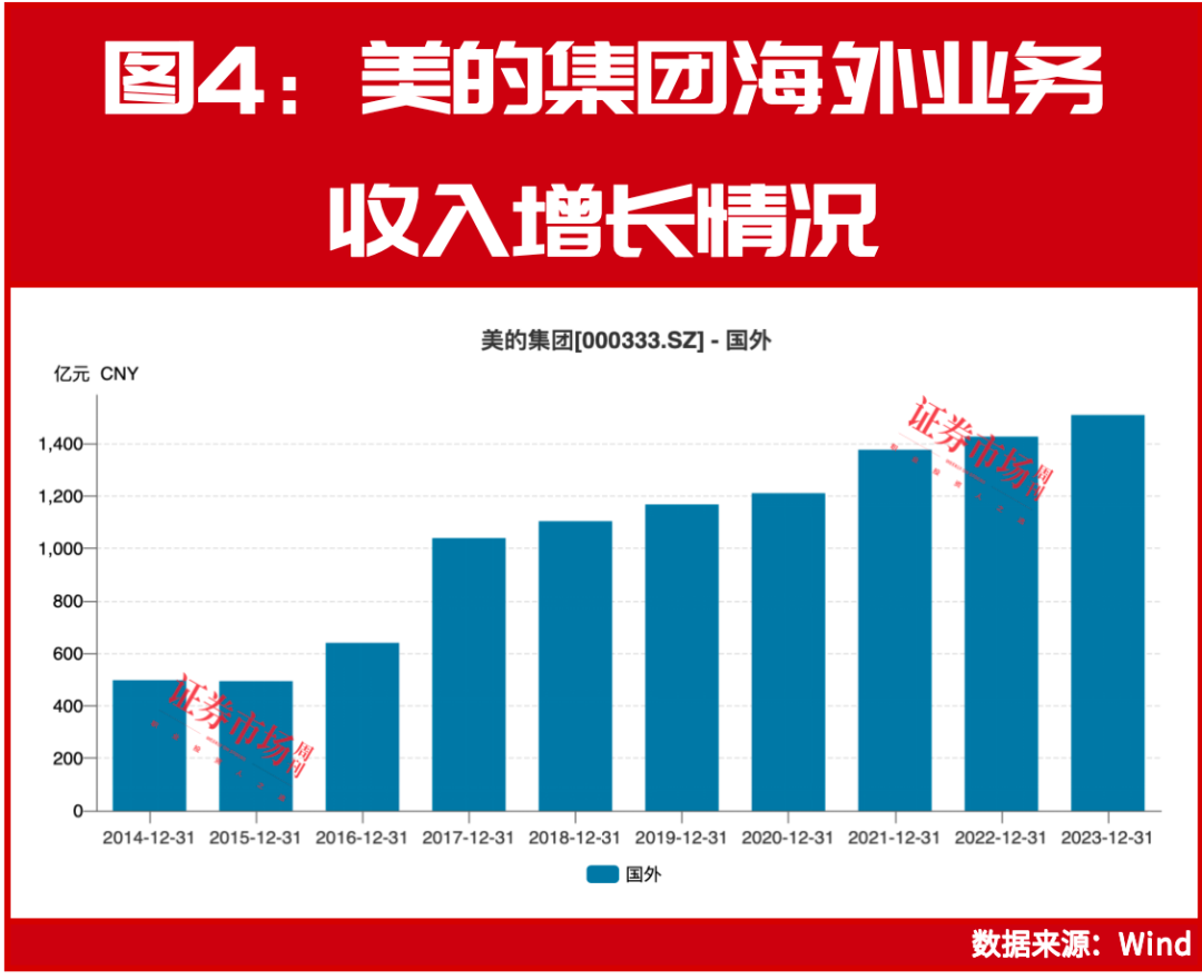 财报显示,2022年、2023年, 美的集团的海外业务都已经占到全部营收的40%以上,分别为1426.45亿元、1509.06亿元,而且近些年来海外业务在持续增长。(见图4)