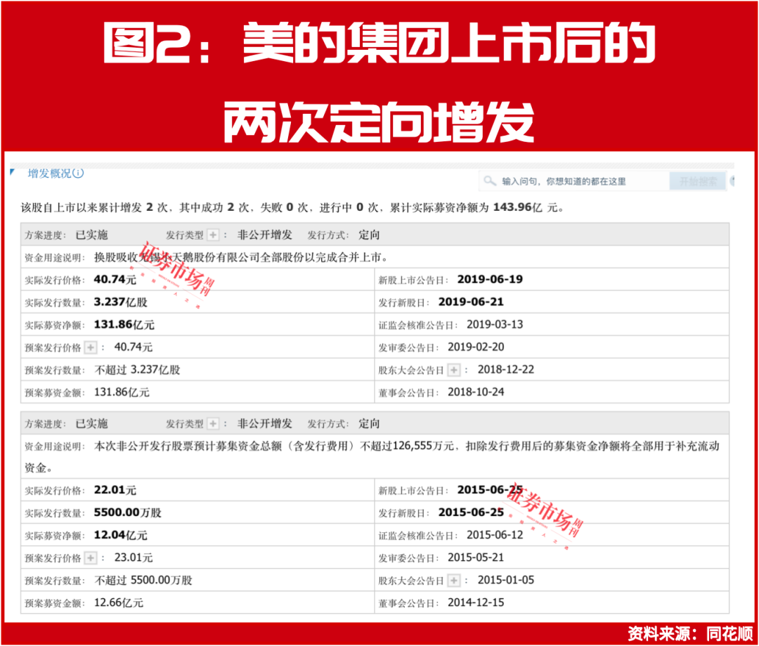 复盘历史,在2013年上市后, 美的集团只在二级市场通过定向增发融资两次,一次是在2019年收购小天鹅股份(14.280, -0.10, -0.70%),一次是在2015年补充现金流 (见图2)。