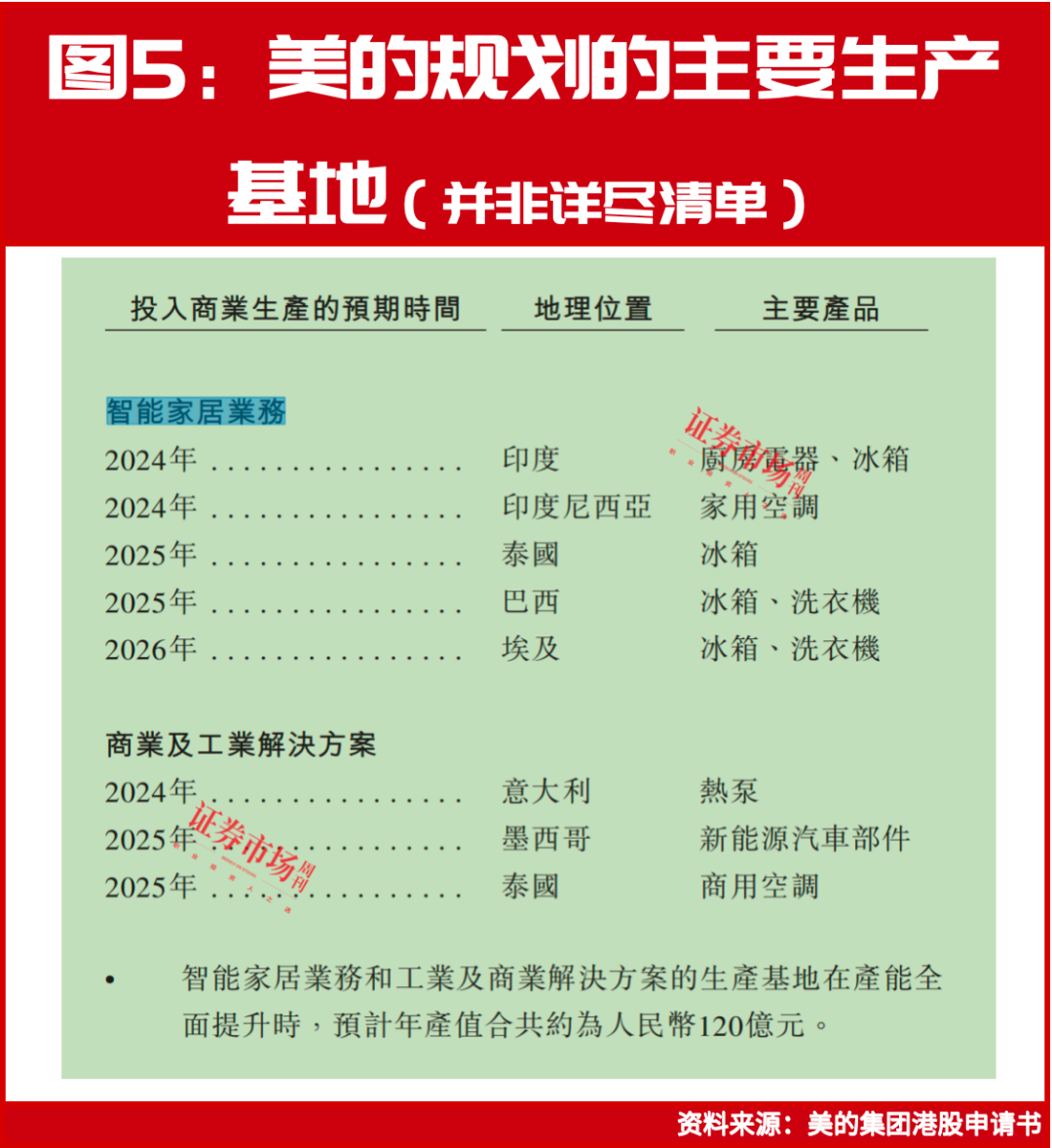 在公司的港股申请书中提到募集的资金, 预期未来一至三年将用于全球科技研发,扩大全球研发团队的规模 ,透过提供具备竞争力的薪资,吸引和挽留拥有高学历及深厚行业经验的研发人才。美的也将进一步扩展全球研发中心的布局,以强化产品本土化开发的能力。公司将结合自主资本开支、合资企业投资和收购等方式,在大型家电市场或欧洲、拉美、非洲、印度及东南亚等极具增长潜力的市场扩大产能,提升海外生产规模及质量,以满足当地客户对于我们智能家居业务和商业及工业解决方案的需求。图5为规划的全球生产基地。