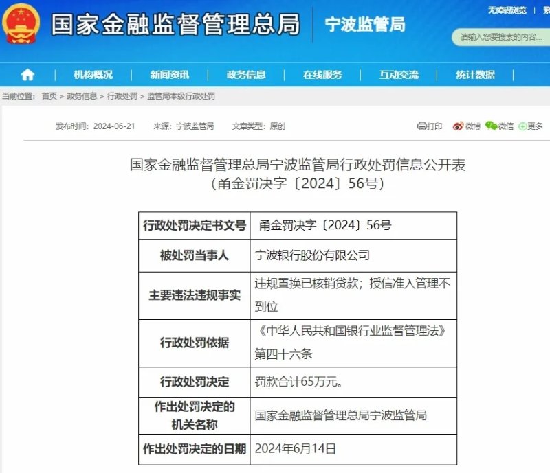 具体来看,今年6月21日,据国家金融监督管理总局宁波监管局披露的行政处罚信息公开表,宁波银行因违规置换已核销贷款、授信准入管理不到位两项违法违规事实,被罚款 65 万元。时任网络银行部副总经理许建明因对相关违规行为负有直接管理责任,被给予警告。