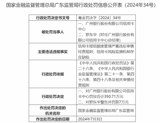 7月5日,国家金融监督管理总局广东监管局公布的一则行政处罚信息显示,广州银行信用卡中心因信用卡授信额度管理严重违反审慎经营规则、信用卡风险监测机制存在缺陷,被罚没合计350.71万元。其中,时任广州银行信用卡中心总经理罗东华被警告并罚款7万元。