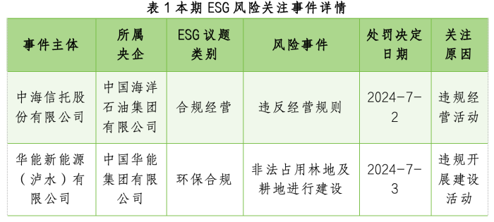 本期央企及控股子公司ESG风险事件中,重点关注的事件主体为中海信托股份有限公司以及华能新能源(泸水)有限公司,所属央企分别为中国海洋石油集团有限公司与中国华能集团有限公司。中海信托股份有限公司因资金管理严重违反审慎经营规则与多项经营违规被开出大额罚单,华能新能源(泸水)有限公司因非法占用林地进行建设被勒令没收已建成建筑构物并处以罚款。风险事件详情如下表所示: