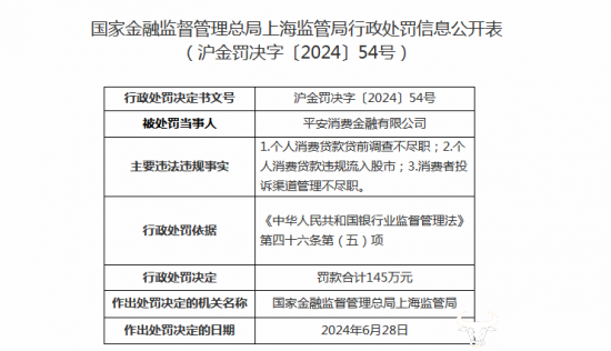 此前,国家金融监督管理总局披露一则行政处罚信息公开表,据行政处罚决定书“沪金罚决字〔2024〕54号”显示,平安消金因个人消费贷款贷前调查不尽职;个人消费贷款违规流入股市;以及消费者投诉渠道管理不尽职,被国家金融监督管理总局上海监管局于6月28日作出罚款145万元的行政处罚。