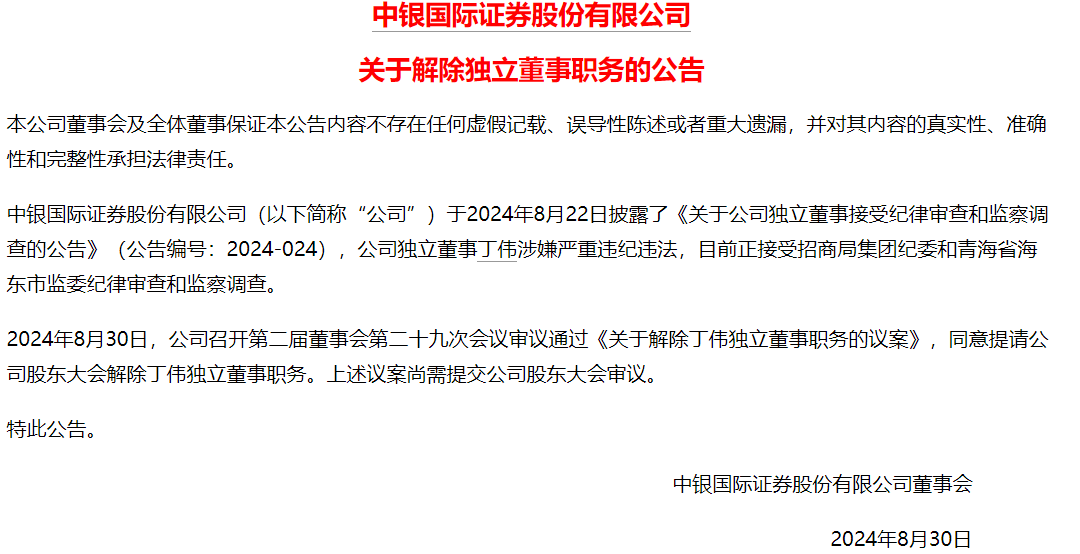 8月21日,中银证券发布公告称,公司通过中央纪委国家监委网站获悉,公司独立董事丁伟涉嫌严重违纪违法,目前正接受招商局集团纪委和青海省海东市监委纪律审查和监察调查。10日之内,中银证券迅速召开相关会议,同意提请公司股东大会解除丁伟独立董事职务。