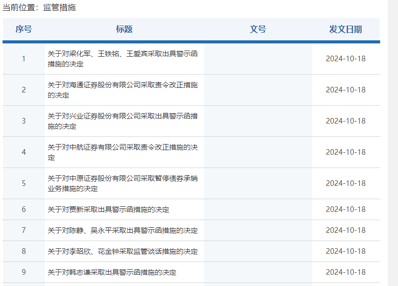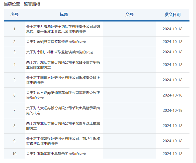 仅10月18日一天,证监会就在官网一口气公布了19张罚单,涉及中信建投(25.900, -0.20, -0.77%)、海通证券(11.910, -0.07, -0.58%)、银河证券、光大证券(17.340, -0.06, -0.34%)、兴业证券(6.320, -0.05, -0.78%)、中航证券、中原证券(4.420, -0.02, -0.45%)、开源证券、东北证券(7.600, -0.03, -0.39%)等多家券商,以及申万宏源(5.270, -0.02, -0.38%)承销保荐、东方证券(10.500, -0.11, -1.04%)承销保荐2家公司。