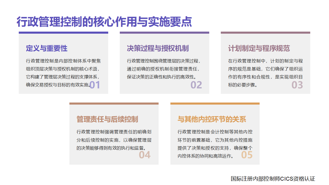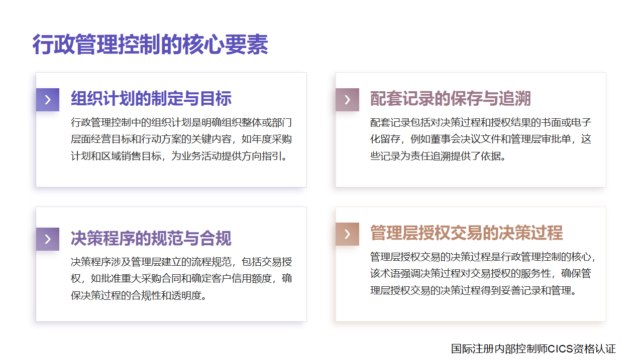 在内部控制体系中,“行政管理控制” 是聚焦组织顶层决策与授权机制的核心术语,其核心内涵是围绕管理层决策过程构建的、支撑交易授权与目标落地的管控体系,不仅涵盖计划制定与程序规范,更强调通过明确授权衔接管理责任与后续控制,是会计控制等其他内控环节的 “前置基础”。