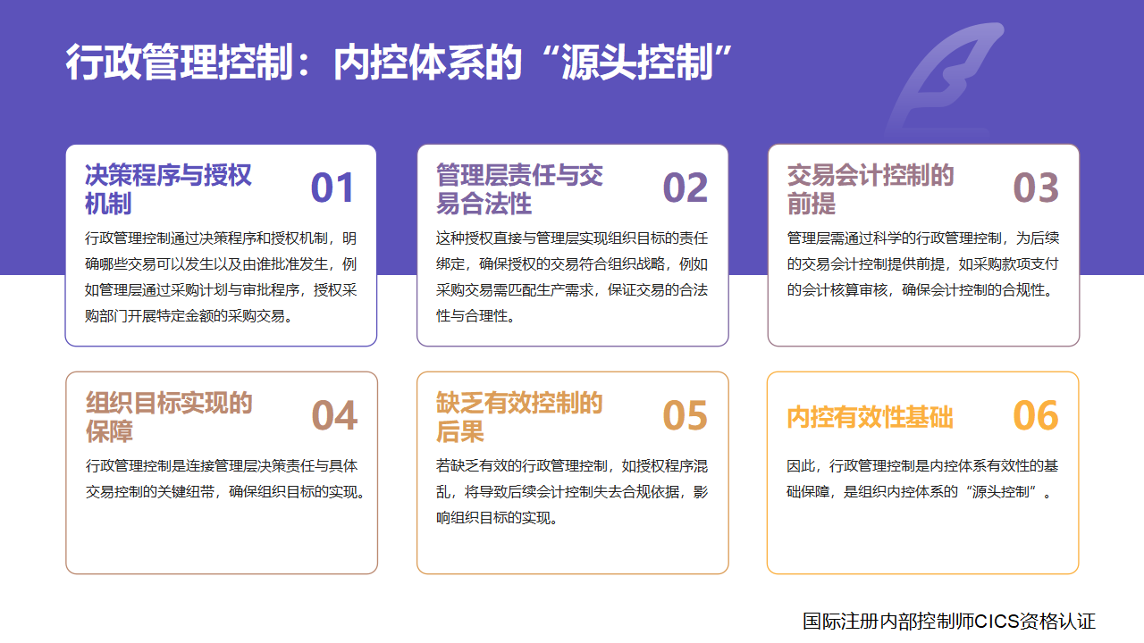 从内部控制逻辑来看,行政管理控制是组织内控体系的 “源头控制”:一方面,其核心功能是通过决策程序与授权机制,明确 “哪些交易可以发生、由谁批准发生”,例如管理层通过采购计划与审批程序,授权采购部门开展特定金额的采购交易,这一授权直接决定后续交易的合法性与合理性;另一方面,这种授权与 “管理层实现组织目标的责任” 直接绑定 —— 管理层需通过科学的行政管理控制,确保授权的交易符合组织战略(如采购交易匹配生产需求),同时为后续 “交易会计控制”(如采购款项支付的会计核算审核)提供前提,若缺乏有效的行政管理控制(如授权程序混乱),后续会计控制将失去合规依据,进而影响组织目标实现。因此,行政管理控制是连接管理层决策责任与具体交易控制的关键纽带,是内控体系有效性的基础保障。
