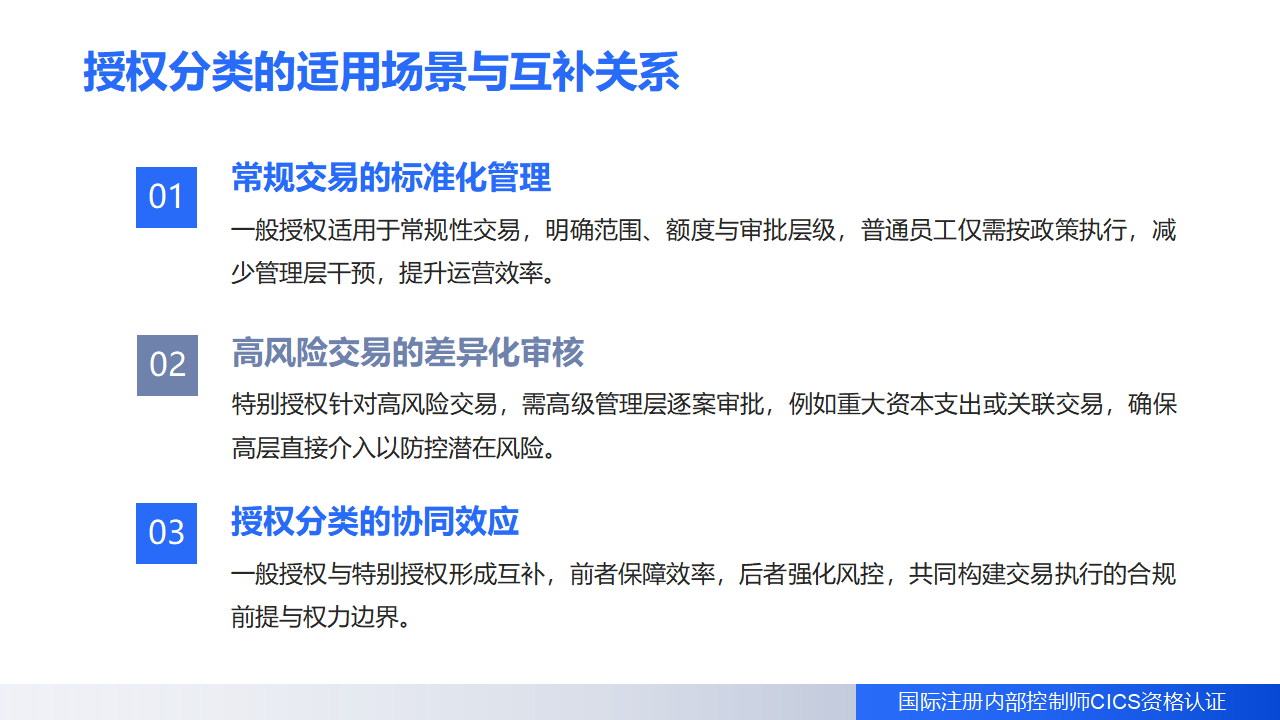 在内部控制体系中,“授权” 是规范交易发起与执行、明确权力边界的核心管控术语,其核心内涵是交易需依据管理层设定的“一般授权” 或 “特别授权” 开展,通过“标准化政策 + 差异化审批” 的双重机制,确保交易在合规框架内执行,同时防范越权操作风险。
