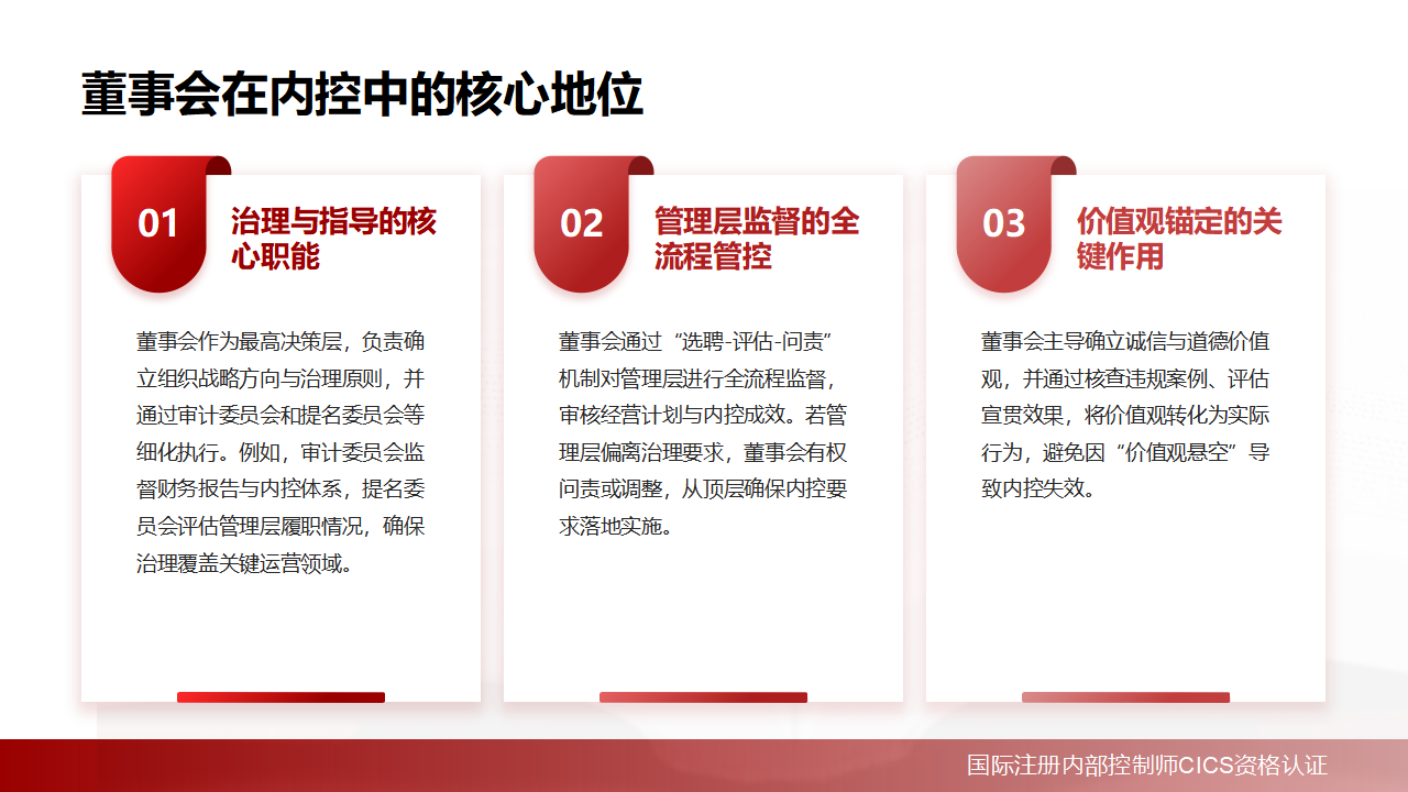 从核心权责来看,董事会的职能聚焦三大维度,且主要董事会委员会(如审计委员会、提名委员会)会围绕细分领域深化履职:一是“治理与指导”,作为最高决策层,董事会负责确立组织战略方向与核心治理原则(如内控体系建设目标、风险偏好),并通过主要委员会将治理要求具象化 —— 例如审计委员会聚焦财务报告与内控监督,提名委员会负责管理层选聘与履职评估,确保治理决策覆盖组织关键运营领域;二是 “管理层监督”,董事会通过 “选聘 - 评估 - 问责” 的全流程管控管理层,要求管理层对其负责,例如审核管理层提交的经营计划、评估内控体系运行成效,若管理层出现偏离治理要求的行为(如忽视内控漏洞),董事会有权启动问责或调整管理层,从顶层确保内控要求落地;三是 “价值观锚定与监督”,董事会主导确立组织的诚信与道德价值观(如合规经营、廉洁从业),并通过监督活动(如核查员工违规案例处理情况、评估价值观宣贯效果)确认价值观是否转化为实际行为,避免 “价值观悬空” 导致内控失效。
