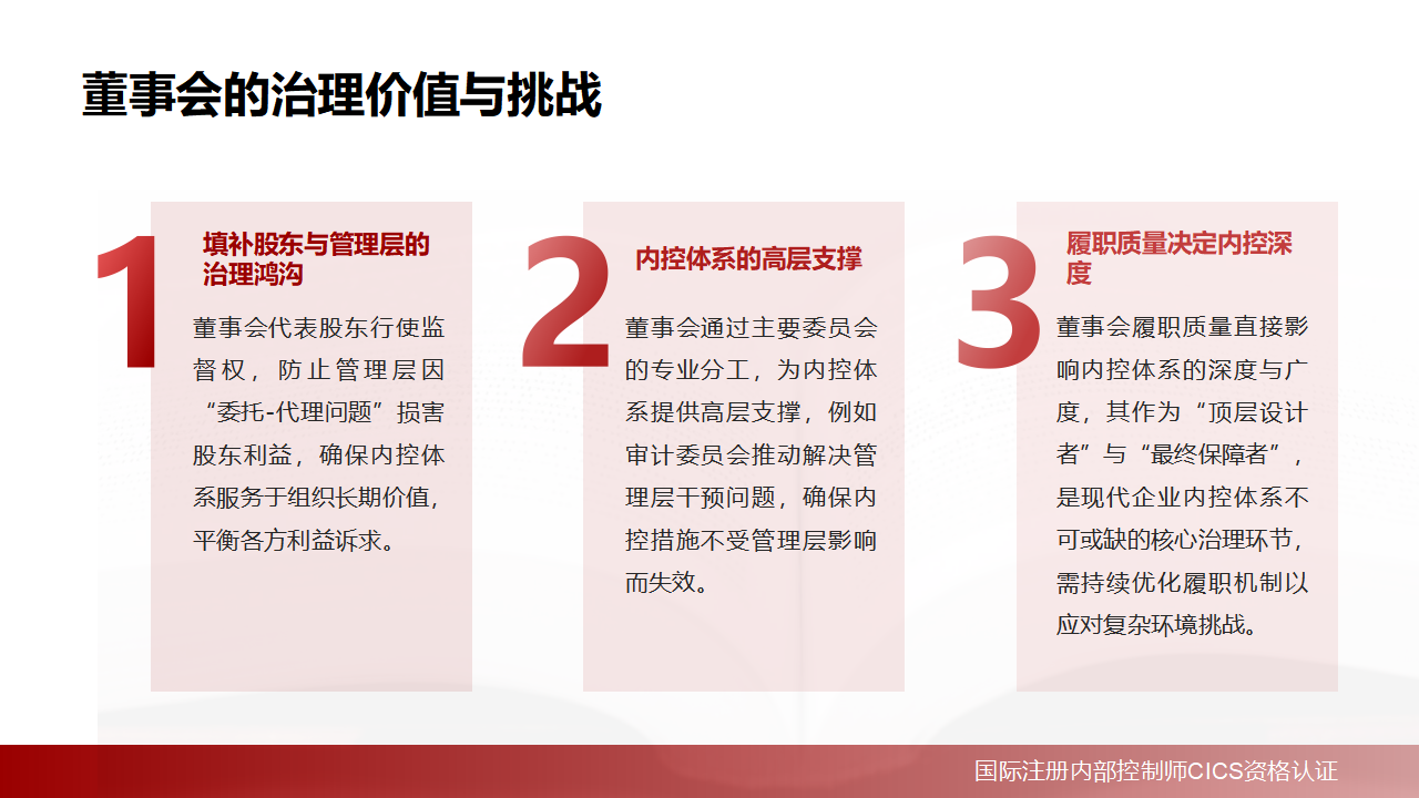 从内部控制逻辑来看,董事会的核心价值在于“填补股东与管理层之间的治理鸿沟”:一方面,它代表股东行使监督权,防止管理层因 “委托 - 代理问题” 损害股东利益(如通过虚增业绩掩盖内控缺陷),确保内控体系始终服务于组织长期价值;另一方面,它通过主要委员会的专业分工,为内控体系提供 “高层支撑”—— 例如审计委员会推动解决管理层凌驾内控的问题,为内部审计与外部监管提供背书,避免内控措施因管理层干预无法执行。因此,董事会不仅是组织治理的 “顶层设计者”,更是内控体系有效性的 “最终保障者”,其履职质量直接决定组织内控的深度与广度,是现代企业内控体系不可或缺的核心治理环节。