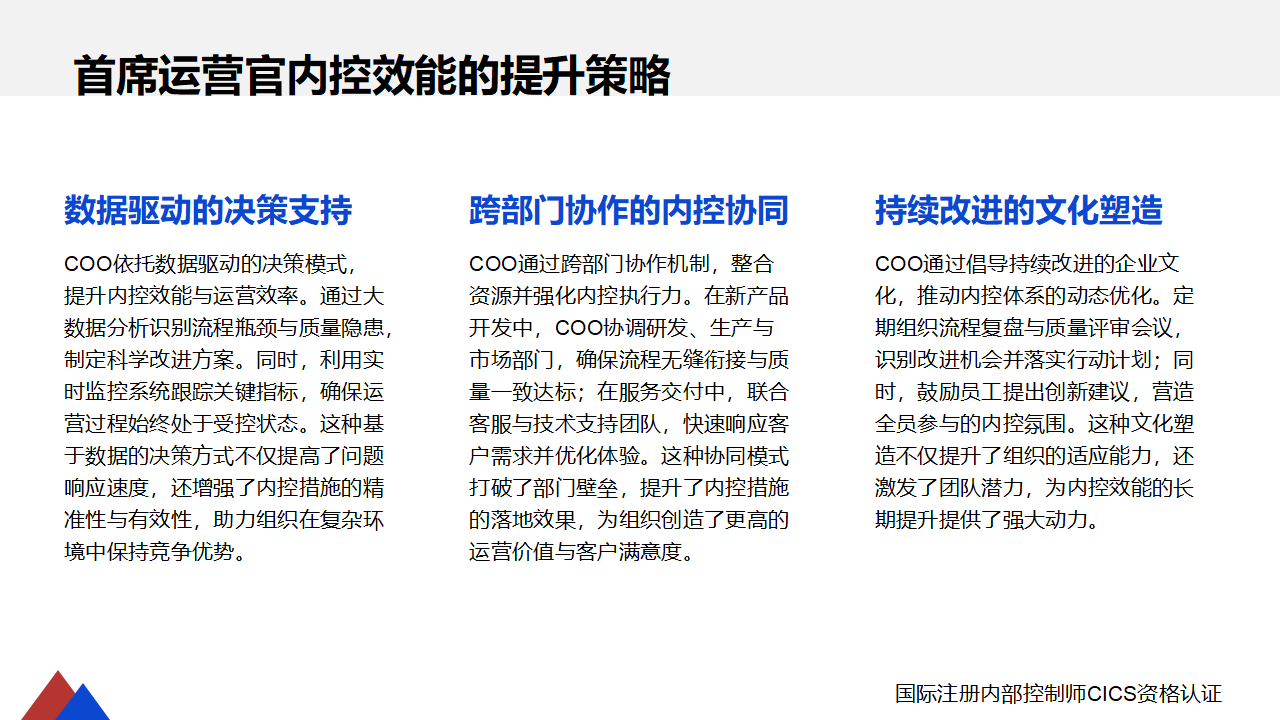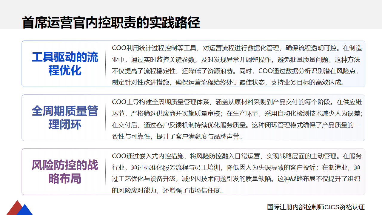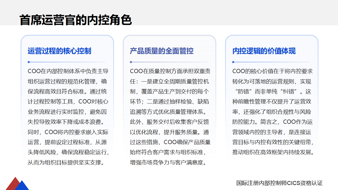 简言之,COO 并非单纯的 “运营执行者”,而是运营领域内控的 “主导者”,通过对过程与质量的专业管控,将内控要求转化为可落地的运营规则,确保组织运营在合规、高效的框架内推进,是连接运营目标与内控有效性的关键纽带。