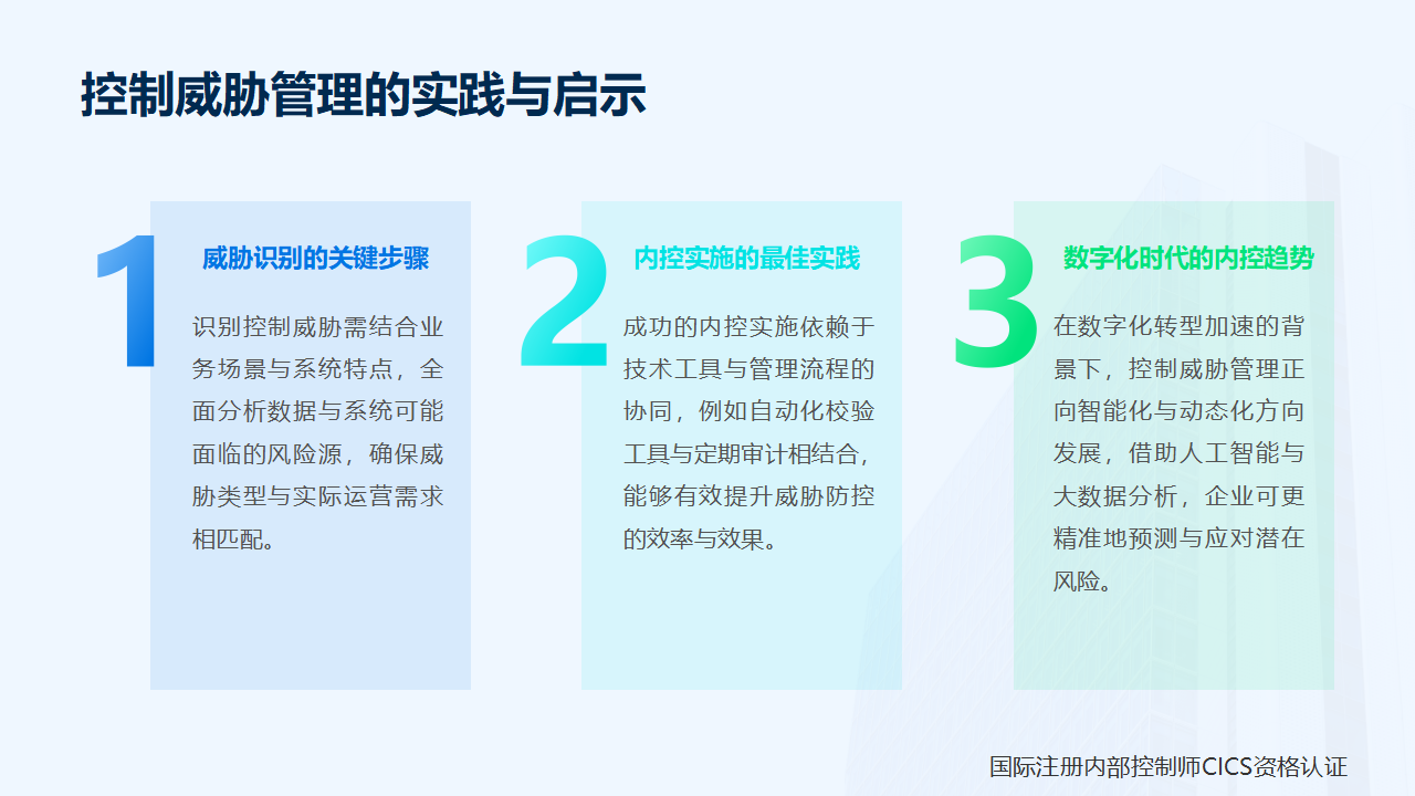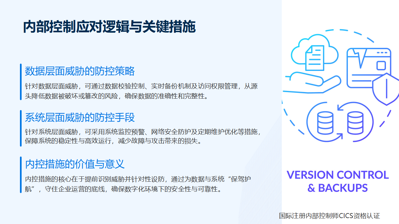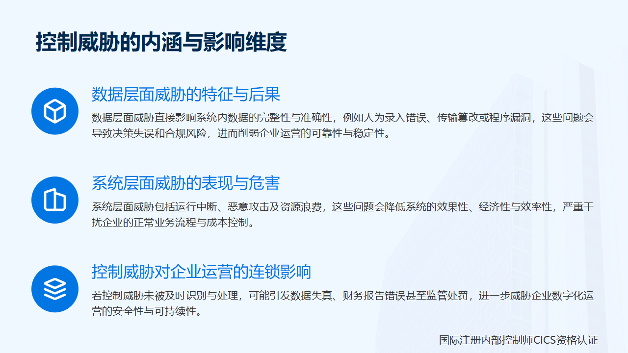 从内控价值来看,控制威胁的识别与防控是“守住系统运行底线” 的关键:在计算机化业务占比越来越高的当下,数据与系统是企业运营的核心支撑,若控制威胁未被及时处理,可能引发连锁风险(如数据错误导致财务报告失真,进而触发监管处罚)。因此,对控制威胁的管理,本质是通过内控措施为数据与系统 “保驾护航”,确保企业数字化运营的安全性与可靠性。