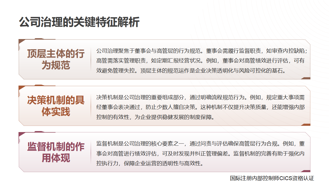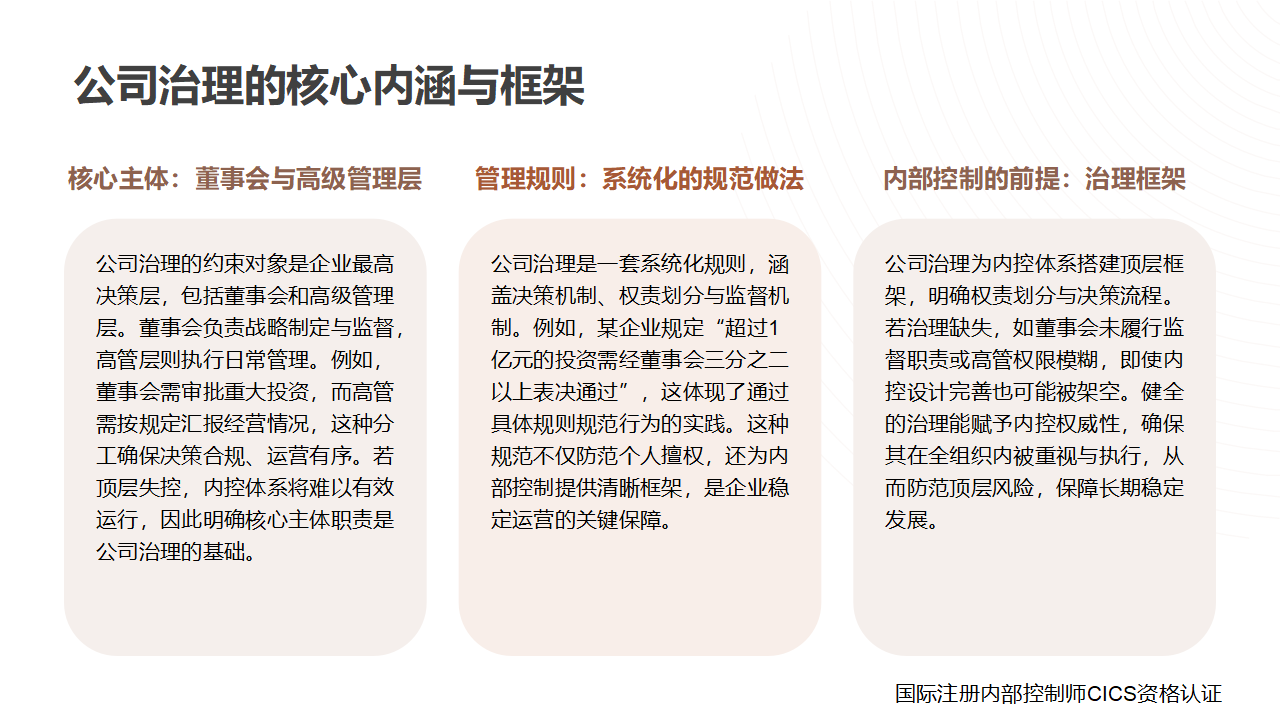 在内部控制体系中,“公司治理” 是界定组织顶层管理规则、规范核心决策层行为的基础性框架,其核心内涵是围绕“控制与支配” 企业展开,特指董事会与公司高级管理层管理公司时应遵循的一系列做法,是保障企业决策合规、运营有序的顶层制度设计,也是内部控制有效落地的前提。