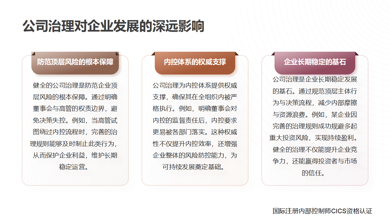 从内部控制逻辑来看,公司治理的核心价值是“为内控体系搭建顶层框架”:内部控制需要依托清晰的权责划分、规范的决策流程才能有效运行 —— 若公司治理缺失(如董事会未履行监督职责、高管权限无明确边界),即使设计完善的内控措施(如审批流程、风险评估),也可能因 “顶层失控” 被架空(如高管绕过内控流程决策)。反之,健全的公司治理(如明确董事会对内控的监督责任)能为内控提供 “权威支撑”,确保内控要求在全组织内被重视、被执行,是企业防范顶层风险、保障长期稳定运营的 “根本保障”。