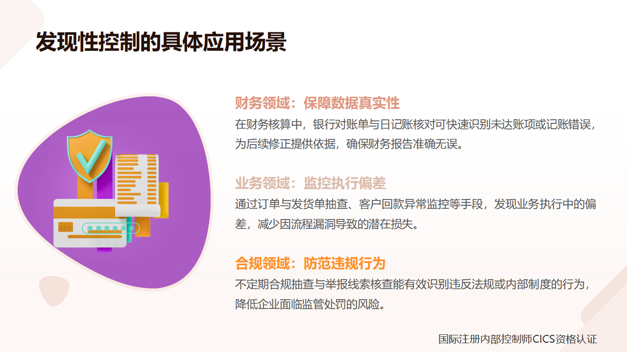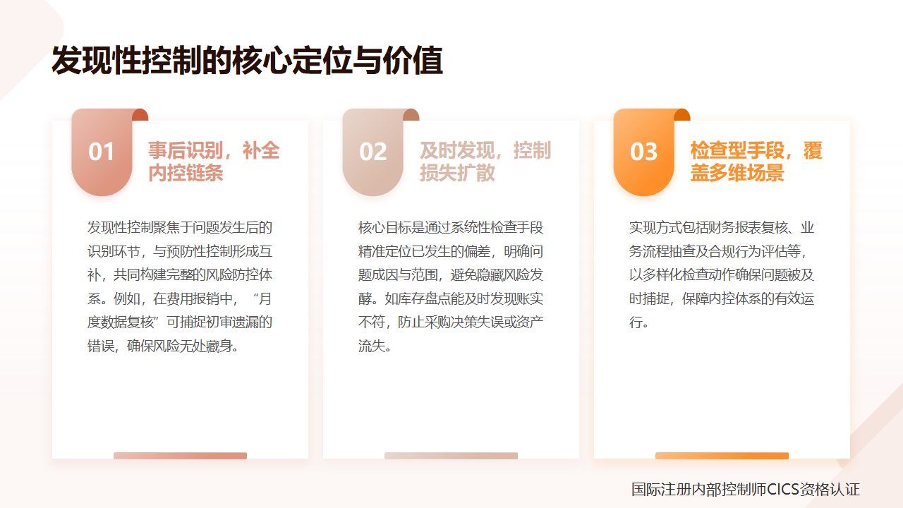 在内部控制体系中,“发现性控制” 是与预防性控制并列的两大核心控制类型之一,其核心内涵是通过检查、监控、核对等手段,识别已发生的错误、违规行为或流程偏差,并为后续处理动作提供依据,最终确保问题得到迅速解决的控制措施。它是内控体系中针对“已发生风险” 的关键应对环节,旨在及时捕捉问题、避免损失扩大,同时为内控优化提供方向。