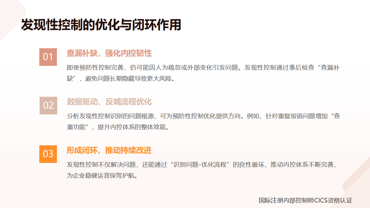 从内部控制价值来看,发现性控制是保障内控有效性的“关键补充”:即使预防性控制设计完善,仍可能因人为疏忽(如员工操作失误)、外部环境变化(如供应商临时违约)或流程漏洞(如制度未覆盖的特殊场景)导致问题发生。此时,发现性控制能及时“查漏补缺”,避免问题长期隐藏引发更大风险(如未发现的记账错误导致财务报告失真、违规行为累积引发监管处罚)。同时,通过分析发现性控制识别的问题根源,还能反哺预防性控制的优化(如针对重复报销问题,在预防性控制中增加 “报销记录查重” 功能),推动内控体系持续完善,形成 “识别问题 - 优化流程” 的良性循环。