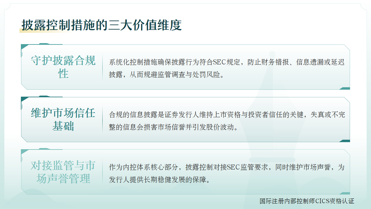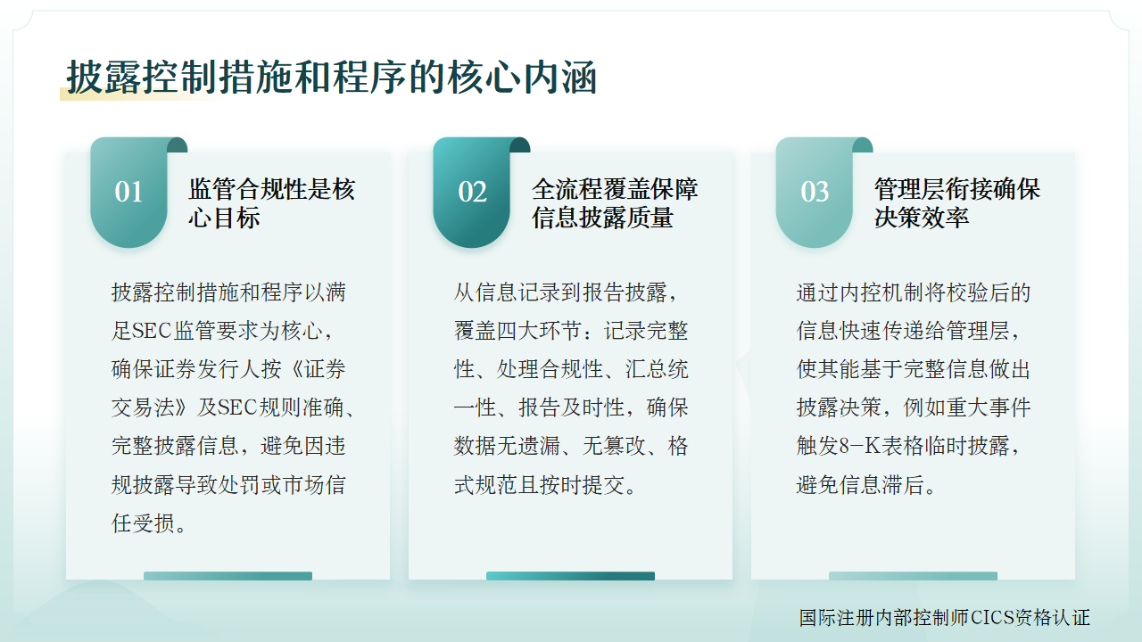 从内部控制价值来看,披露控制措施和程序的核心作用是“守护证券发行人的披露合规与市场信任”: