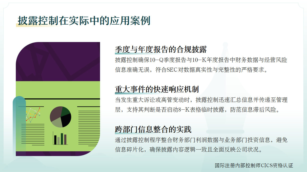 这类控制措施和程序不仅包含信息处理的技术与流程控制,还明确要求“确保需披露的信息被汇总并传达给管理层”—— 即通过内控机制,将经过校验、汇总的披露信息及时传递给发行人管理层(如 CEO、CFO),让管理层能基于完整、准确的信息,快速做出 “是否披露、披露哪些内容、如何披露” 的决策。例如,当公司发生可能影响股价的重大事件(如重大诉讼、核心高管变动)时,披露控制需确保事件详情被迅速汇总并传递给管理层,管理层可及时判断是否需按 SEC 规则启动 “8-K 表格” 的临时披露,避免因信息传递滞后导致披露不及时。