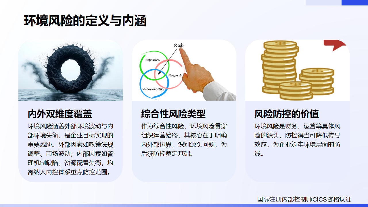 内部控制术语讲解36:环境风险在内部控制体系中,“环境风险”是聚焦组织内外部环境因素、可能影响目标实现的综合性风险类型,其核心内涵是与组织运营所处环...
