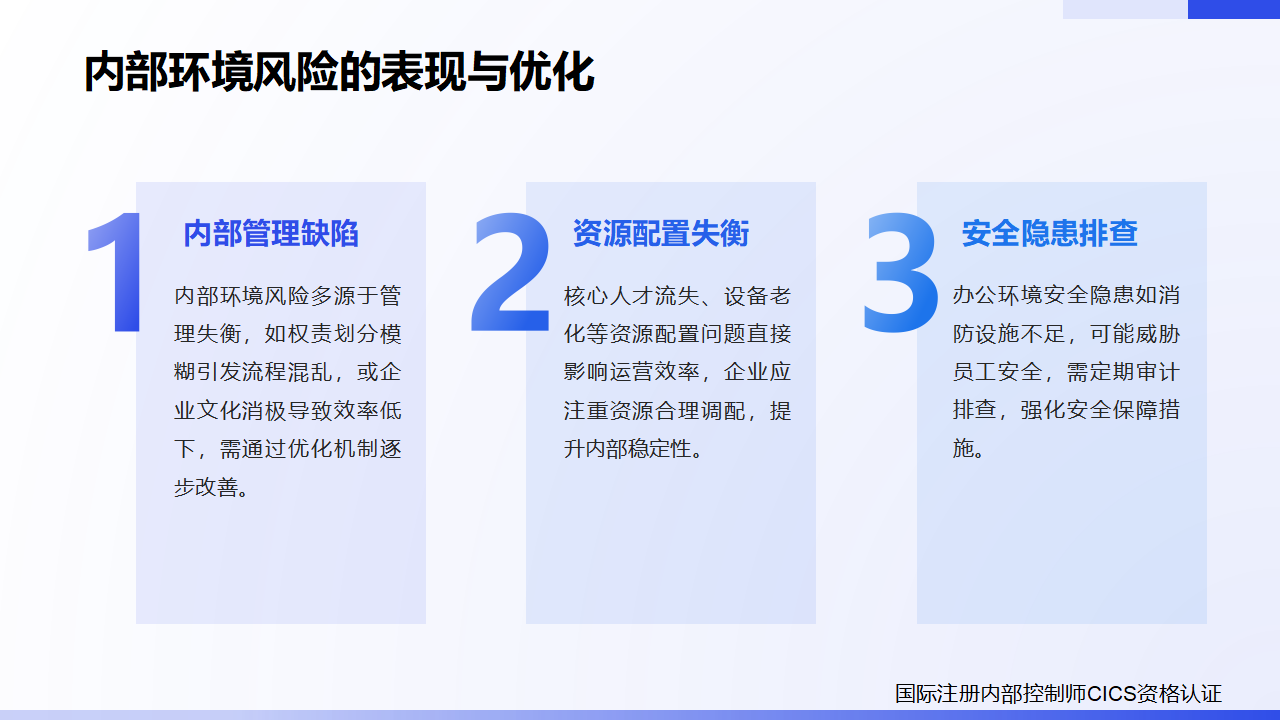 2.内部环境风险:源于组织内部运营环境的失衡或缺陷。例如企业文化氛围消极(如员工凝聚力不足导致效率低下)、内部管理机制不完善(如权责划分模糊引发流程混乱)、资源配置不合理(如核心技术人才流失)、办公环境安全隐患(如消防设施不足),这类风险直接与组织内部管理水平、资源状态相关,可通过内控优化逐步降低。
