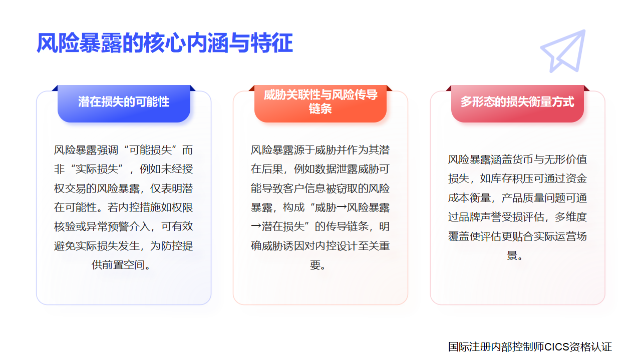 在内部控制体系中,“风险暴露” 是描述组织面临潜在损失可能性的核心风险术语,其核心内涵是存在可能导致组织损失的特定事件或场景,但该事件仅代表“损失的可能性”,而非已实际发生损失。它源于威胁可能引发的潜在损害,这种潜在损失既可以用货币金额衡量,也可通过无形价值(如声誉、信任)评估,是企业风险识别与内控设计的重要关注对象。