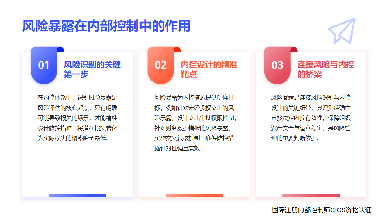 从内部控制逻辑来看,风险暴露的核心价值是“为内控防控提供精准靶点”:在风险评估环节,识别风险暴露是关键第一步 —— 只有明确组织存在哪些 “可能导致损失的场景”(如 “未经授权支出的风险暴露”“财务数据错报的风险暴露”),才能针对性设计内控措施(如 “支出审批权限控制”“财务数据交叉复核”),将潜在损失转化为实际损失的概率降至最低。可以说,风险暴露是连接 “风险识别” 与 “内控设计” 的桥梁,其识别的准确性直接决定内控措施的有效性,是保障组织资产安全、运营稳定的重要风险判断依据。