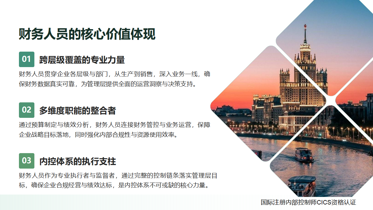 为协助组织设计、执行和评估内部控制系统,以及协助管理部门设置风险控制、优化业务流程和实现控制目标作好了各种准备。 国际注册内部控制师CICS资格认证项目,专为志在内部控制、风险管理与合规领域深耕的专业人士打造,将帮助你快速提升专业影响力,赢得企业高管及行业认可,成为引领组织稳健发展的关键力量。 如果你渴望在企业管理中脱颖而出,突破职业发展的瓶颈,借助内部控制的专业能力在激烈的职场竞争中掌握主动,欢迎了解国际注册内部控制师项目,实现个人成长与企业发展的双赢。 近期课程安排: 《国际注册内部控制师CICS资格认证》网络课程学习班: 报名链接:http://www.neikong.com/s/pc/#/course/detail/1527212/1473841/info 联系电话:400-098-1119 报名咨询二维码 :