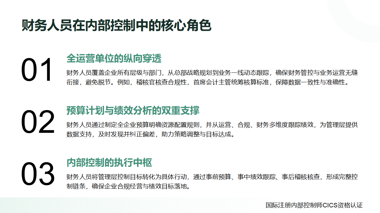 从内部控制逻辑来看,财务人员的核心作用是“管理层控制的‘执行中枢’”: