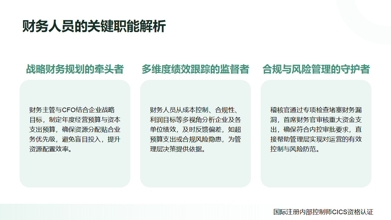 内部控制的有效落地,需要专业力量将管理层的控制目标(如合规经营、成本管控、绩效达标)转化为具体行动—— 财务人员通过制定预算明确资源分配规则(事前控制)、跟踪绩效发现运营偏差(事中控制)、稽核核查纠正合规问题(事后控制),形成完整的控制链条。例如,首席财务官通过审核重大资金支出确保合规(符合内控审批要求),稽核官通过专项检查堵塞财务漏洞,这些动作直接帮助管理层实现 “对运营的有效控制”,是企业内控体系中不可或缺的 “专业执行者与监督者”。