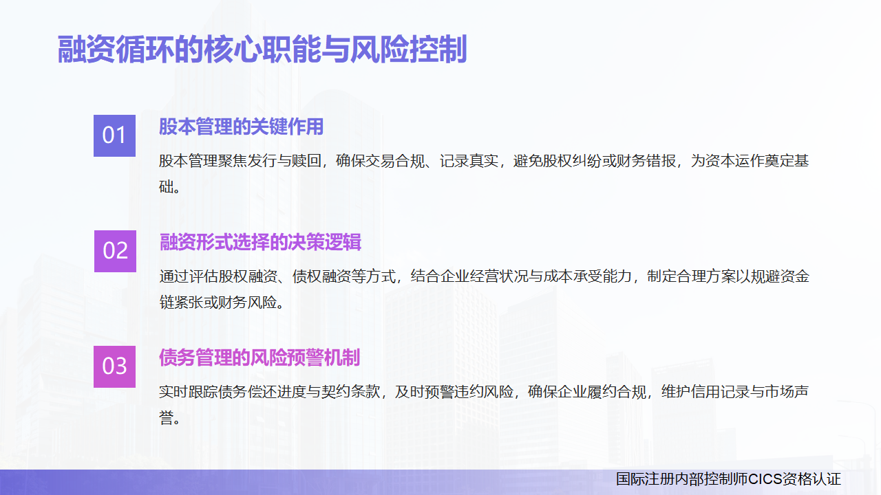 国际注册内部控制师CICS资格认证项目,专为志在内部控制、风险管理与合规领域深耕的专业人士打造,将帮助你快速提升专业影响力,赢得企业高管及行业认可,成为引领组织稳健发展的关键力量。