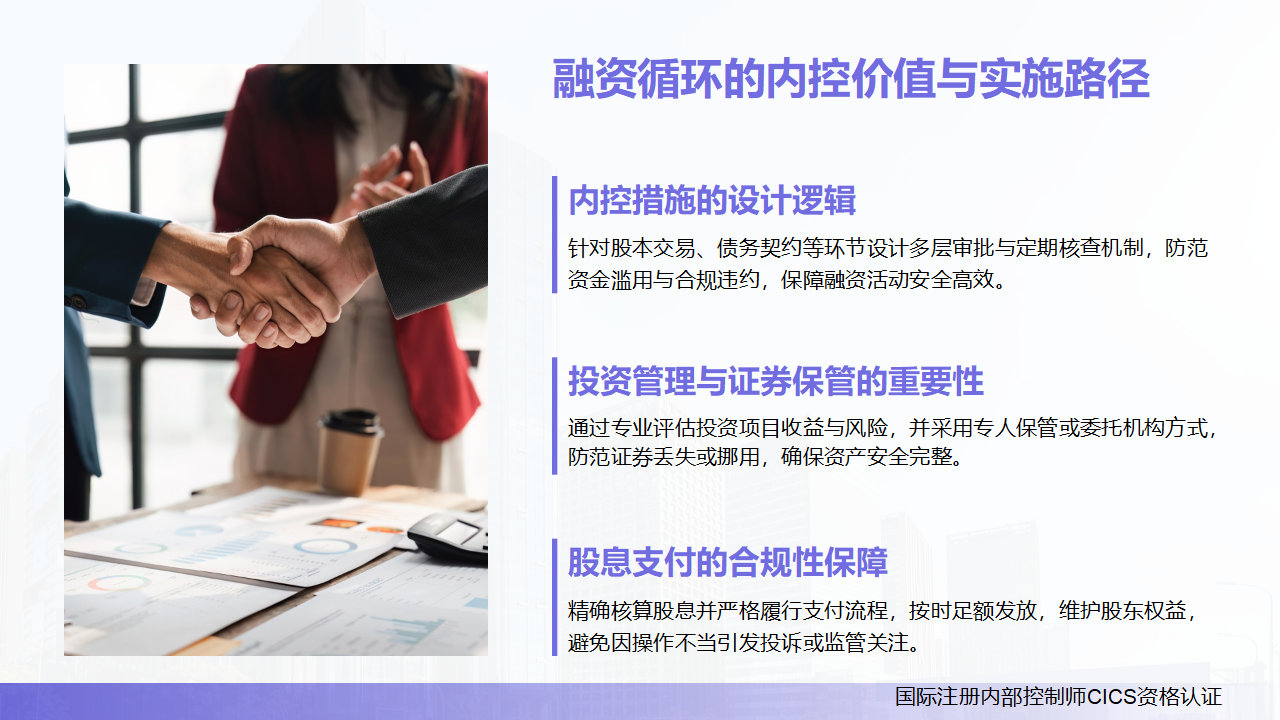 融资循环涉及企业大额资金的筹集、支付与投资,且与股东权益、债务契约、监管法规紧密关联,风险集中度高(如股权发行违规、债务违约、投资亏损)。通过对各职能环节设计内控措施(如股本交易的多层审批、债务契约的定期核查、证券保管的双人对账),可有效防范资金滥用、决策失误、合规违约等风险,确保企业融资活动符合法规要求与战略目标,为企业经营发展提供稳定、安全的资金支持。