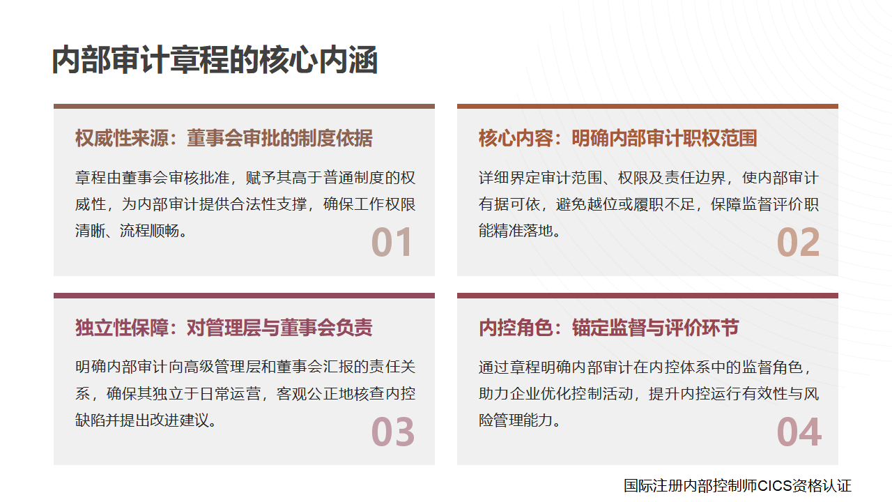 在内部控制与内部审计体系中,“内部审计章程” 是明确内部审计定位、职权与责任的核心文件,其核心内涵是由董事会审核并批准的正式书面文件,主要功能是清晰概述内部审计的职权范围(如审计对象、审计权限、工作流程等),同时明确内部审计职能需对高级管理层和董事会负责,是保障内部审计工作独立、合规开展的“制度基石”。