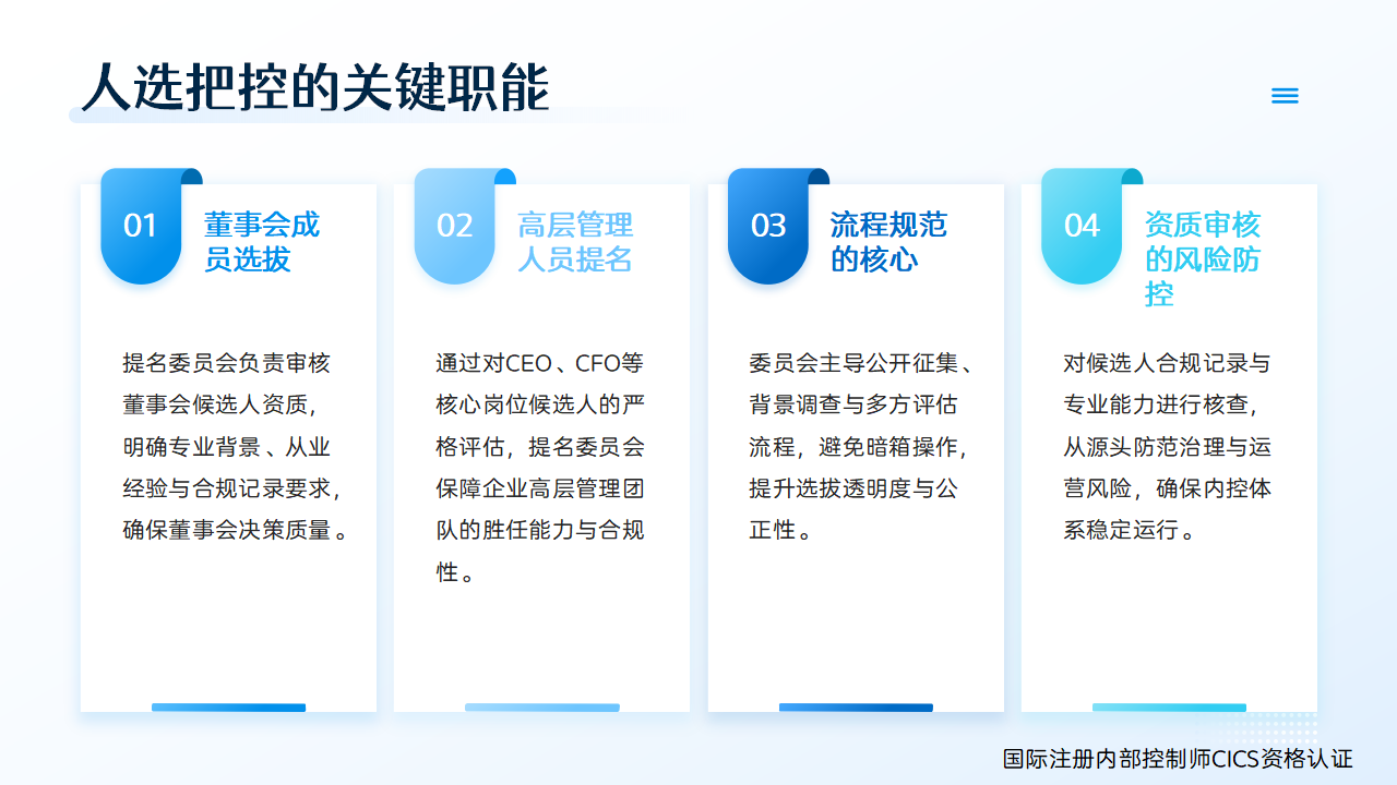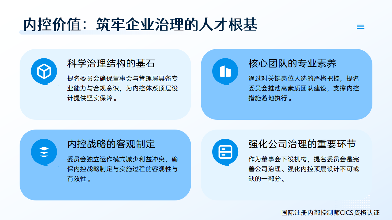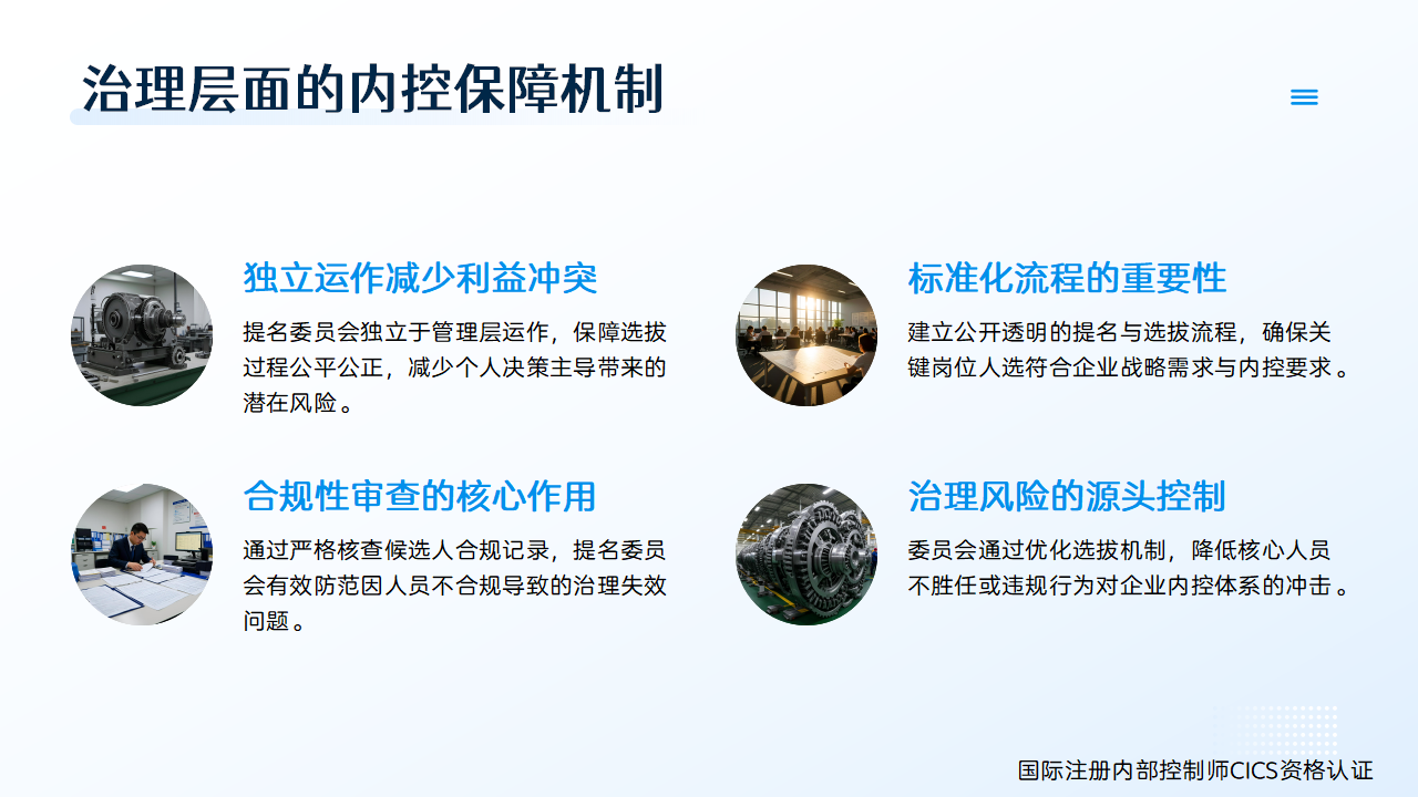 2.本质属性:治理层面的内控保障机制,提名委员会的控制职能并非直接决定人选,而是通过“流程规范 + 资质审核” 实现风险防控:一方面,建立标准化的提名与选拔流程(如公开征集、背景调查、多方评估),避免暗箱操作或个人决策主导;另一方面,对候选人的合规记录、专业能力进行严格核查,确保人选无违法违规记录、具备履行岗位职责所需的专业素养,从源头防范因核心人员不胜任或不合规导致的治理风险、运营风险。
