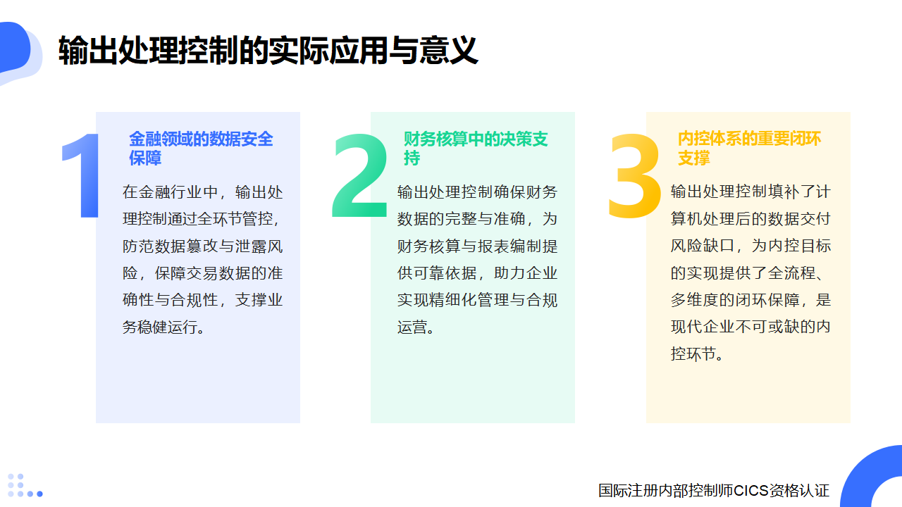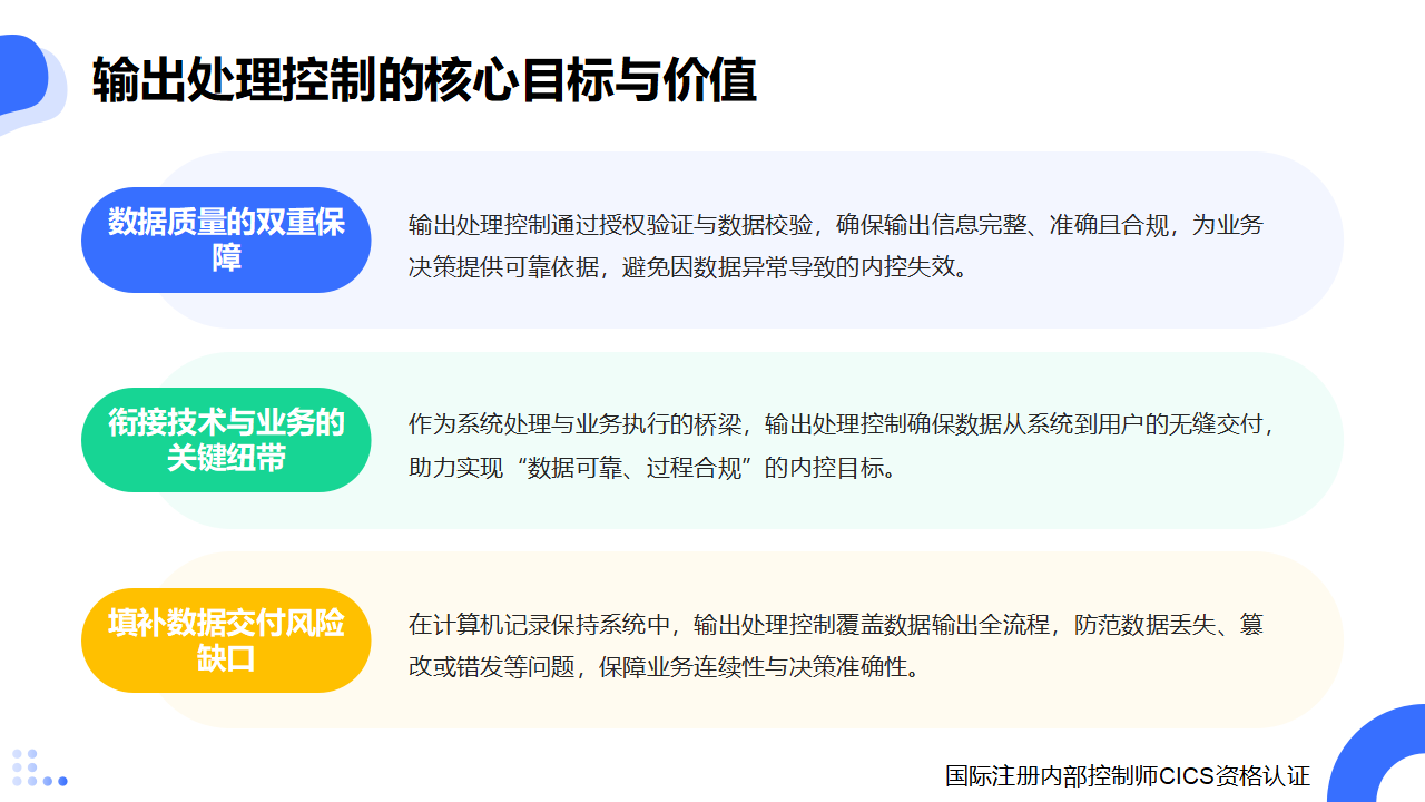 功能用户的日常业务(如财务核算、业务统计)需依赖计算机输出数据开展,若数据存在问题,将直接导致业务失误甚至内控失效。输出处理控制通过把控“数据输出 - 交付” 环节,既确保用户及时获取可用数据,又助力计算机记录保持系统实现 “数据可靠、过程合规” 的控制目标,是连接系统技术层面与业务操作层面的重要内控纽带。