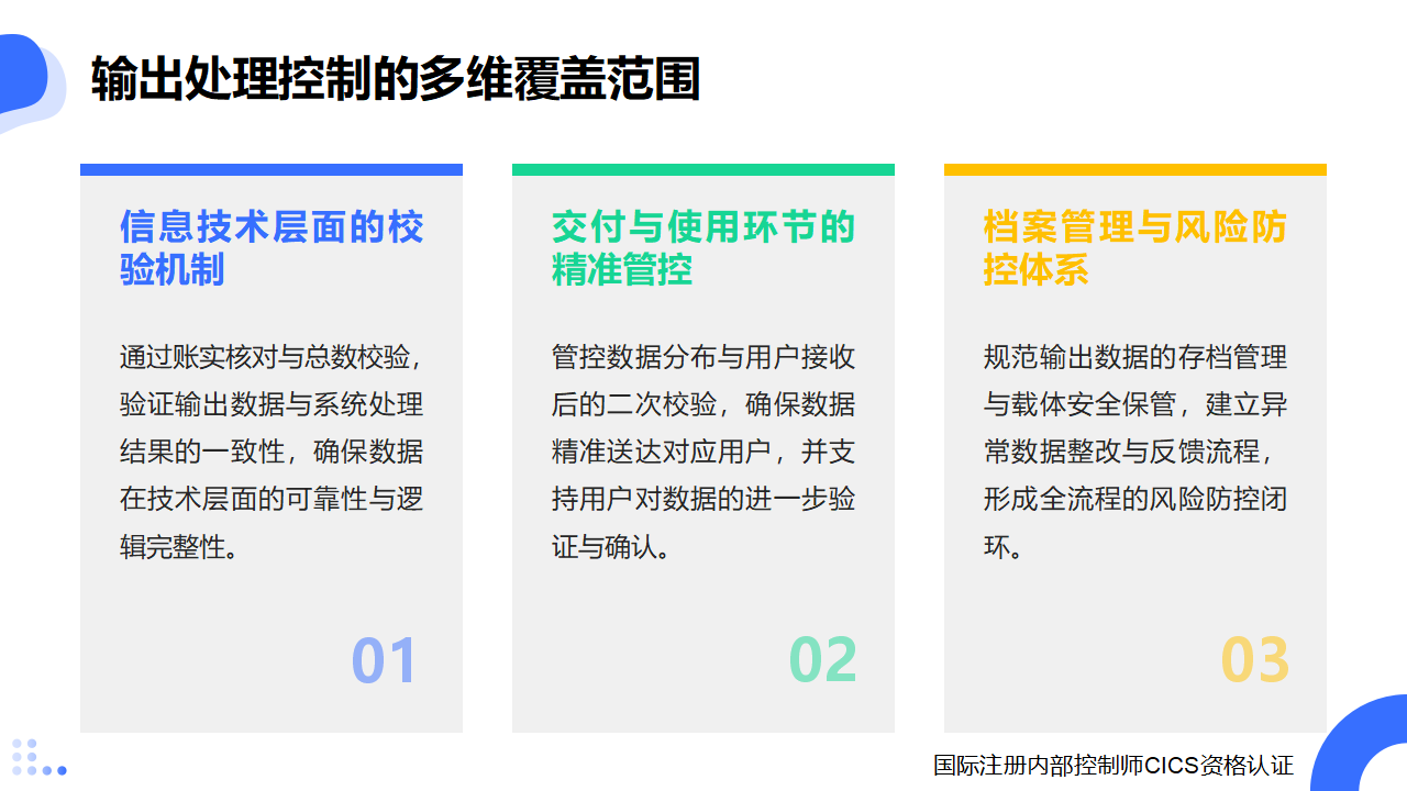 ·档案与风险层面:规范记录保留(输出数据的存档管理)、可靠文档控制(输出载体的安全保管),以及输出错误处理(建立异常数据的整改与反馈流程),形成全流程风险防控。