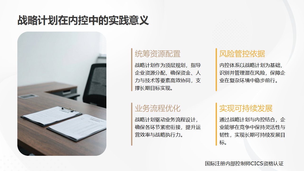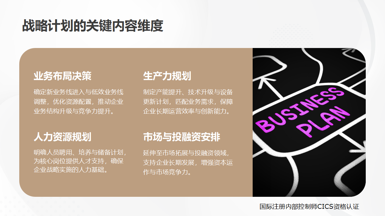 在内部控制与企业管理领域,战略计划是企业层面的高级别长期规划过程,核心内涵是围绕企业发展目标与业务性质制定方向性决策,明确未来较长周期内的发展路径,是统筹企业资源配置、指引经营活动的顶层规划,同时也是内控体系落地的核心依据。