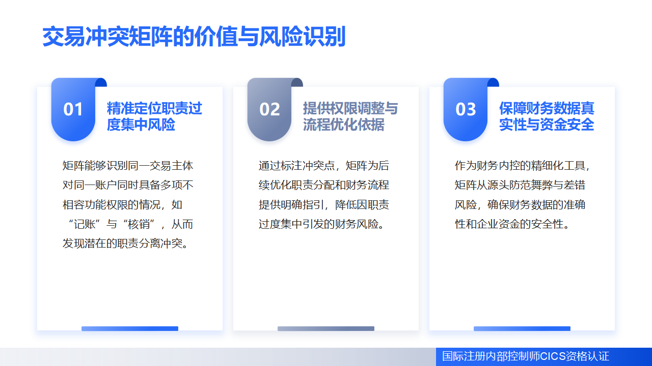 从内部控制逻辑来看,交易冲突矩阵是财务内控“流程层面”的精细化管控工具,它弥补了传统职责分离管控中“重岗位、轻账户”的漏洞,通过聚焦财务账户的交易功能分配,从源头防范因职责过度集中引发的财务风险,保障财务数据的真实性与资金安全。