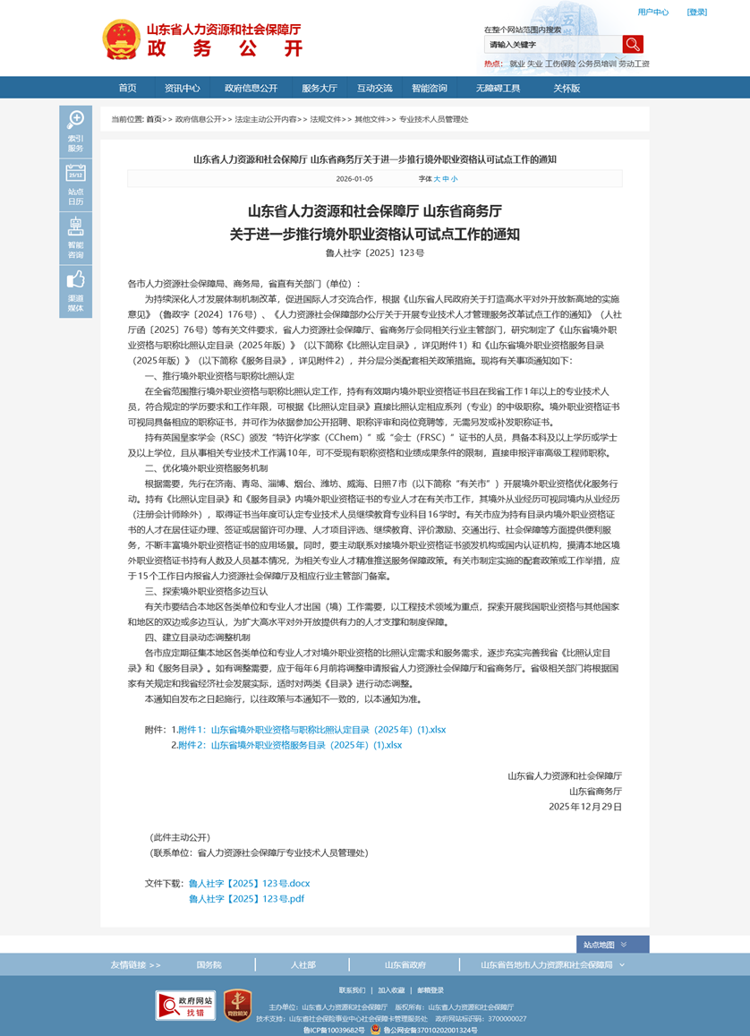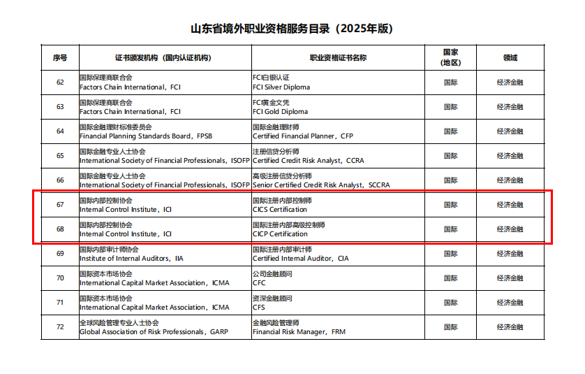 近日,为深化人才发展体制机制改革、促进国际人才交流合作,契合全省打造高水平对外开放新高地的发展需求,山东省人力资源和社会保障厅、山东省商务厅联合发布《关于进一步推行境外职业资格认可试点工作的通知》(鲁人社字〔2025〕123号)(以下简称《通知》)。国际注册内部控制师(CICS/CICP)被纳入《山东省境外职业资格服务目录(2025年版)》(以下简称《目录》),这也为内控领域人才享受地方专属政策、拓宽职业发展路径提供了便利条件。