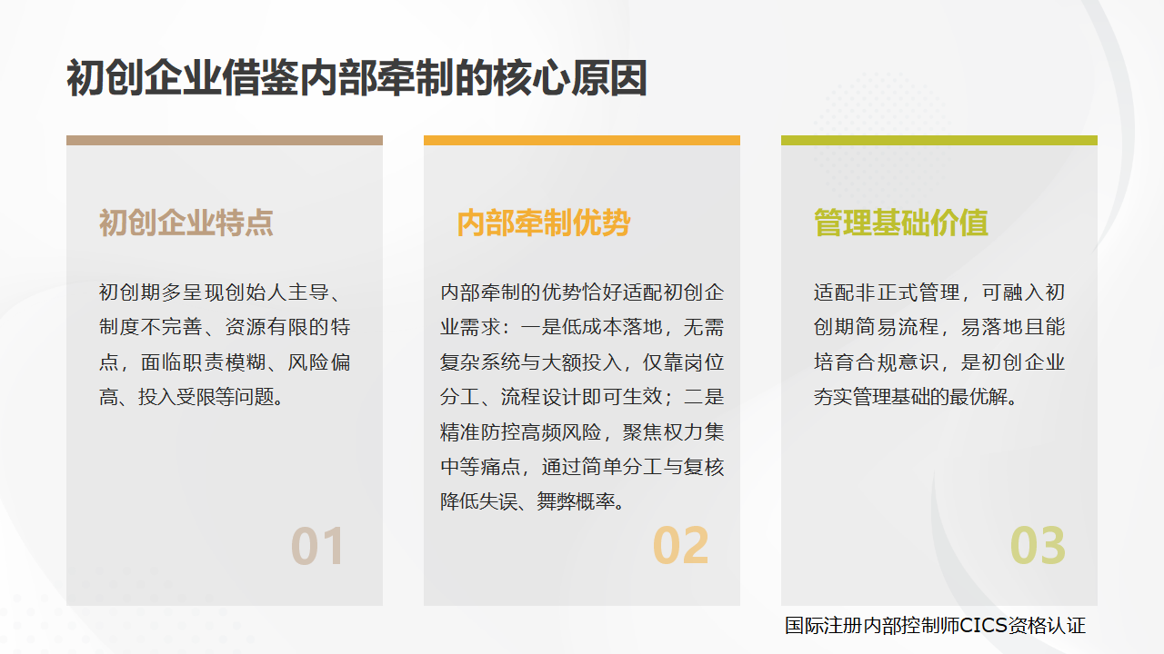 初创期多呈现创始人主导、制度不完善、资源有限的特点,面临职责模糊、风险偏高、投入受限等问题,内部牵制的优势恰好适配:一是低成本落地,无需复杂系统与大额投入,仅靠岗位分工、流程设计即可生效;二是精准防控高频风险,聚焦权力集中等痛点,通过简单分工与复核降低失误、舞弊概率;三是适配非正式管理,可融入初创期简易流程,易落地且能培育合规意识,是初创企业夯实管理基础的最优解。