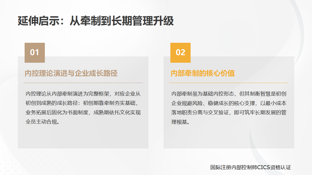 内控理论从内部牵制演进为完整框架,对应企业从初创到成熟的成长路径:初创期靠牵制夯实基础,业务拓展后固化为书面制度,成熟期依托文化实现全员主动合规。综上,内部牵制虽为基础内控形态,但其制衡智慧是初创企业规避风险、稳健成长的核心支撑,以最小成本落地职责分离与交叉验证,即可筑牢长期发展的管理根基。