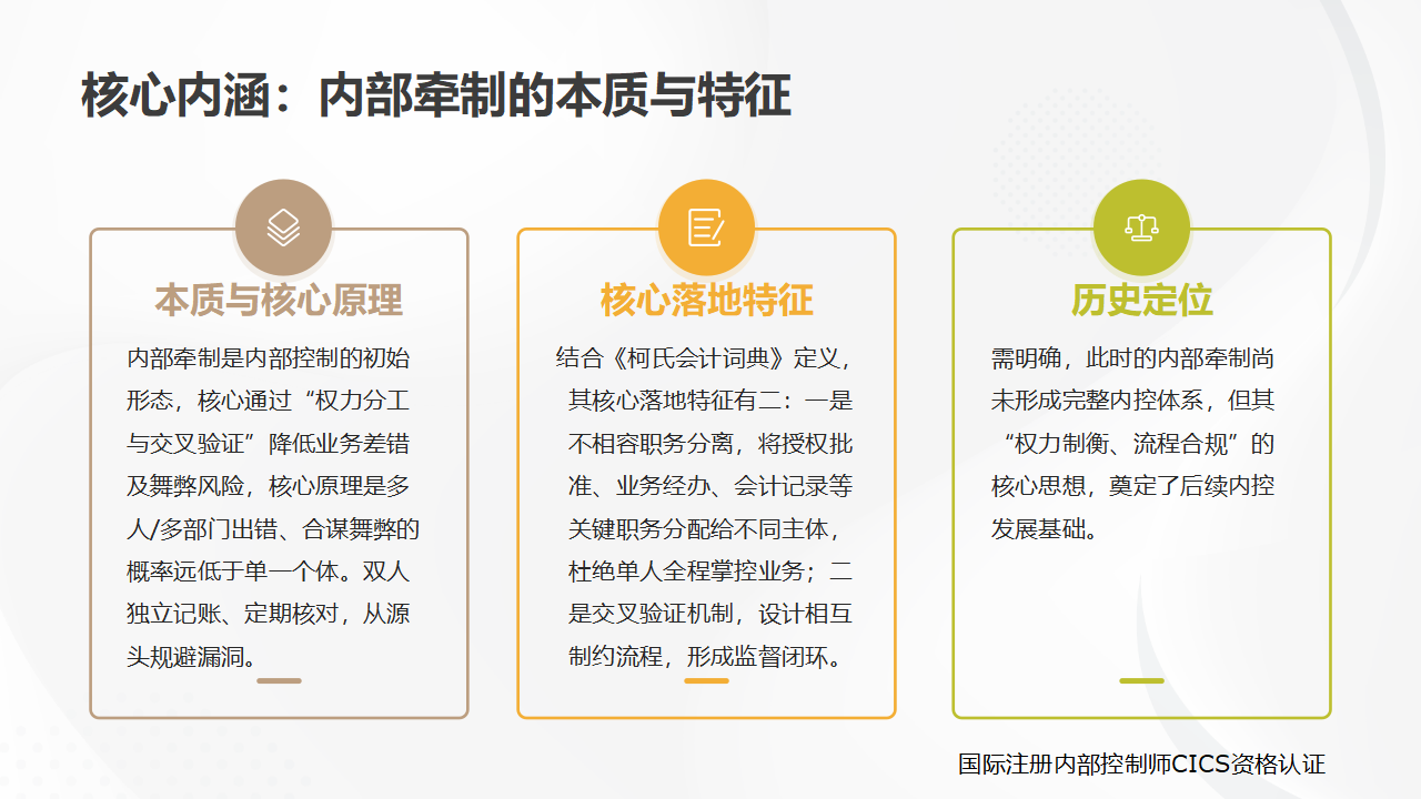 结合《柯氏会计词典》定义,其核心落地特征有二:一是不相容职务分离,将授权批准、业务经办、会计记录等关键职务分配给不同主体,杜绝单人全程掌控业务;二是交叉验证机制,设计相互制约流程,形成监督闭环。需明确,此时的内部牵制尚未形成完整内控体系,但其“权力制衡、流程合规”的核心思想,奠定了后续内控发展基础。