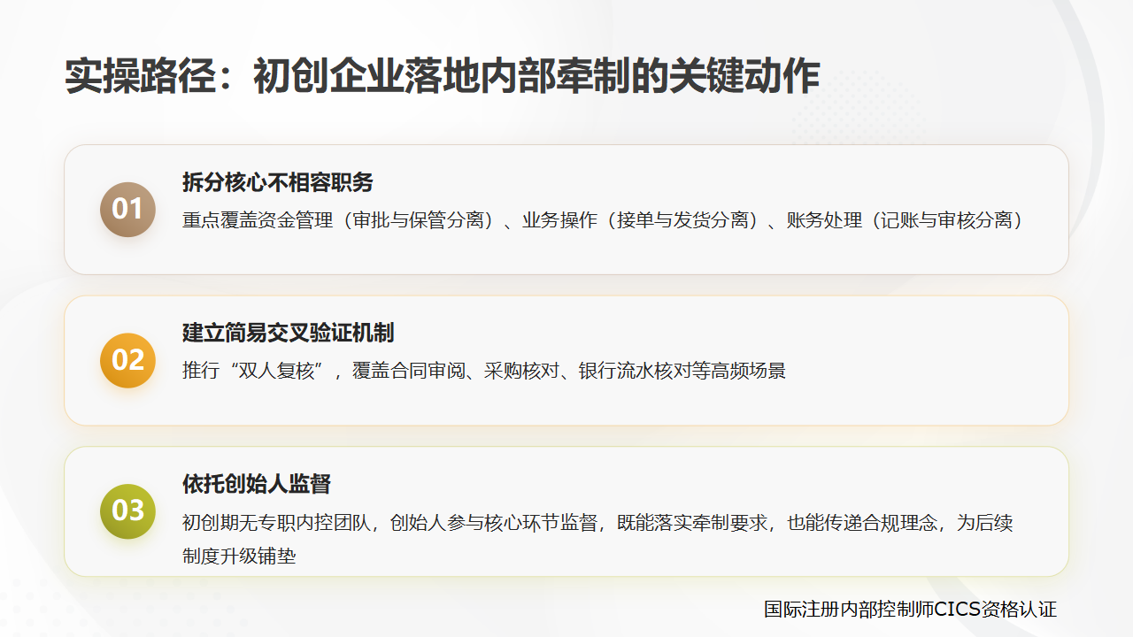 初创企业无需追求体系化,聚焦核心业务落地3个关键动作即可:一是拆分核心不相容职务,重点覆盖资金管理(审批与保管分离)、业务操作(接单与发货分离)、账务处理(记账与审核分离);二是建立简易交叉验证机制,推行“双人复核”,覆盖合同审阅、采购核对、银行流水核对等高频场景;三是依托创始人监督,初创期无专职内控团队,创始人参与核心环节监督,既能落实牵制要求,也能传递合规理念,为后续制度升级铺垫。