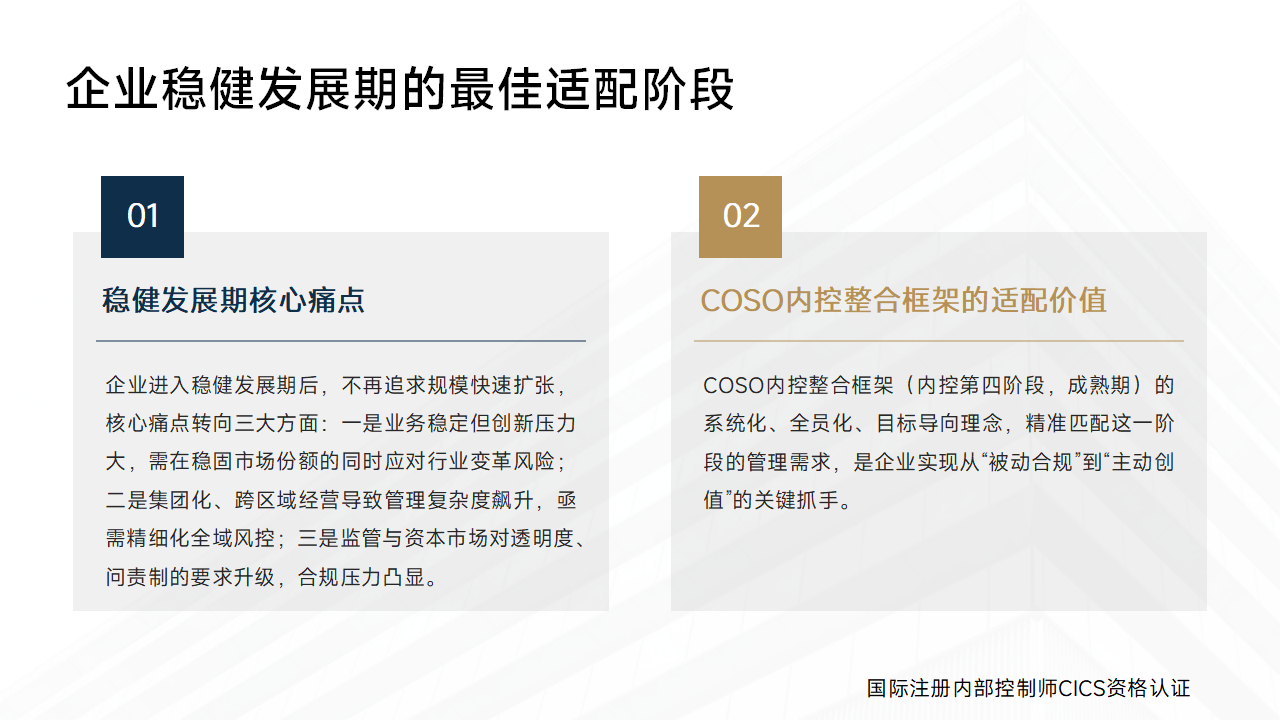 企业进入稳健发展期后,不再追求规模快速扩张,核心痛点转向三大方面:一是业务稳定但创新压力大,需在稳固市场份额的同时应对行业变革风险;二是集团化、跨区域经营导致管理复杂度飙升,亟需精细化全域风控;三是监管与资本市场对透明度、问责制的要求升级,合规压力凸显。而COSO内控整合框架的系统化、全员化、目标导向理念,精准匹配这一阶段的管理需求,是企业实现从“被动合规”到“主动创值”的关键抓手。