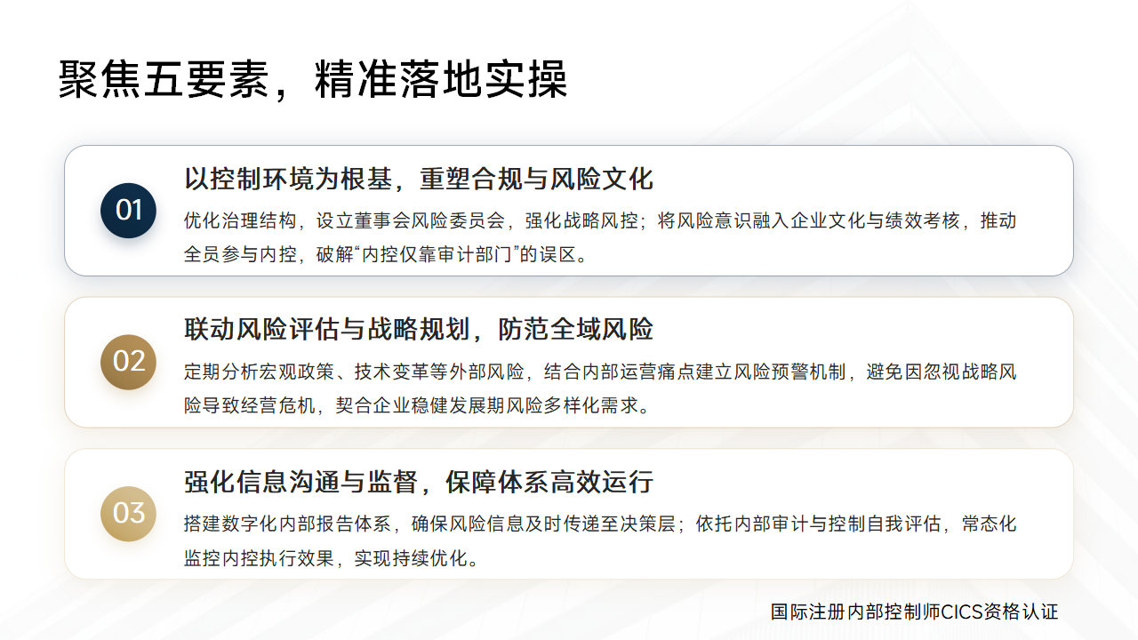 综上,企业稳健发展期借鉴内控整合框架经验,是顺应发展需求的必然选择。聚焦核心要素精准落地,既能防范复杂风险、满足合规要求,更能推动内控体系从“成本中心”向“价值中心”转型,为企业长期稳健发展筑牢内控根基。